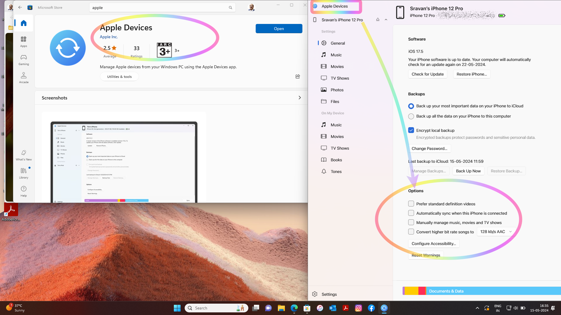 I installed the Apple Devices app from the Windows 11 Microsoft Store to create a local backup. In contrast to iTunes on my old Windows 10 computer, the Apple Devices app doesn't offer to synchronize my iPhone over wifi, which was a very handy feature. Creating an initial backup over USB didn't change this.