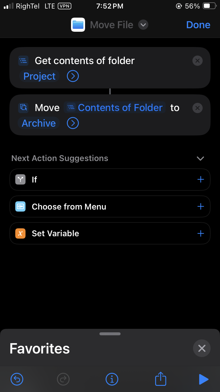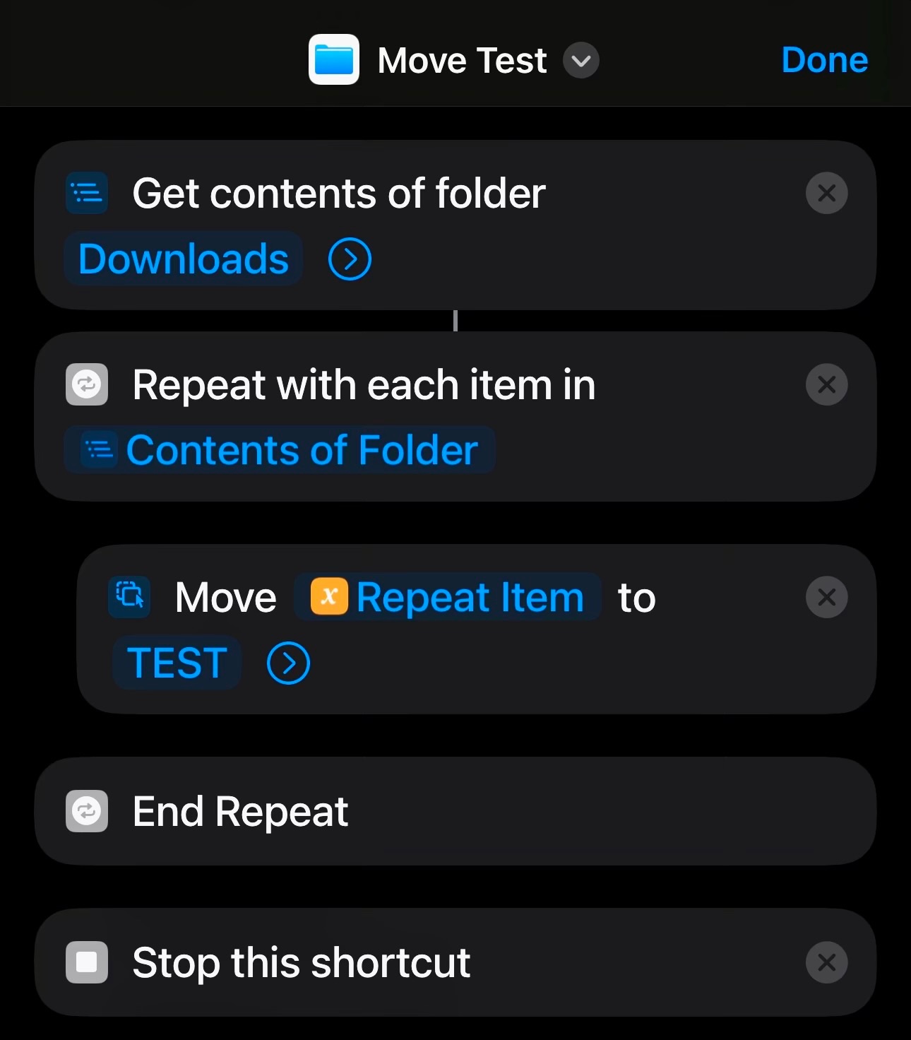 I want to create a shortcut in the shortcut app to move a series of files to another folder. And I want you to do this without asking me which files you want. In fact, it will move the files automatically because I want to put this shortcut in the automation section and not get involved in it myself. Please guide me. I will not reach the result from the way I am going