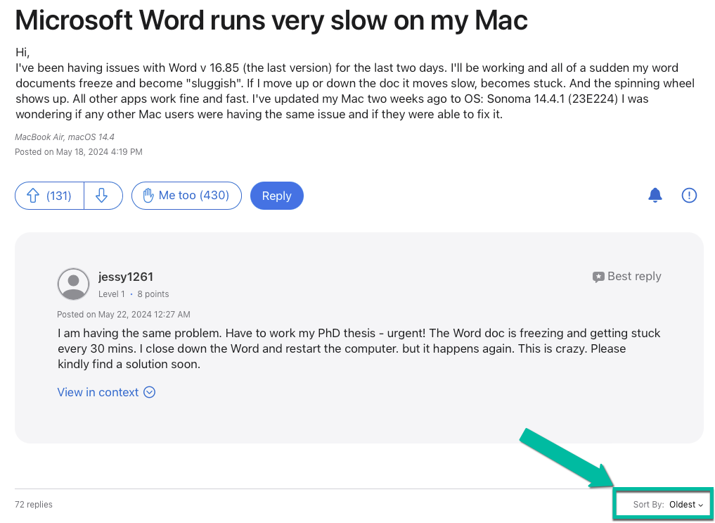 I've been having issues with Word v 16.85 (the last version) for the last two days. I'll be working and all of a sudden my word documents freeze and become "sluggish". If I move up or down the doc it moves slow, becomes stuck. And the spinning wheel shows up. All other apps work fine and fast. I've updated my Mac two weeks ago to OS: Sonoma 14.4.1 (23E224) I was wondering if any other Mac users were having the same issue and if they were able to fix it.