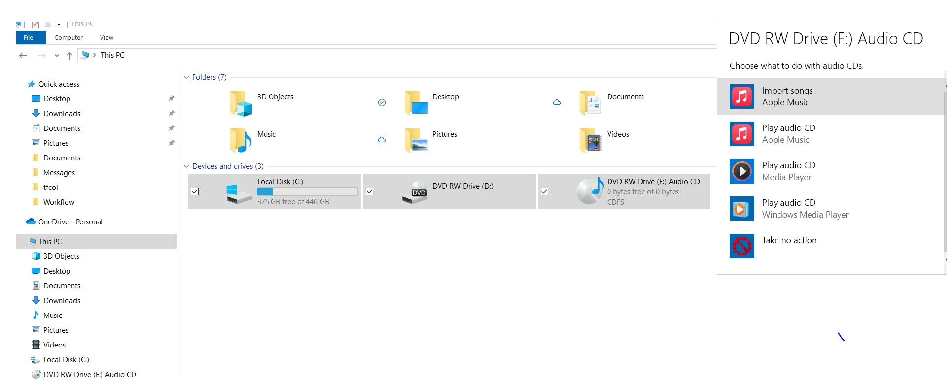 Interestingly enough, I discovered if you right click on the CD in Windows Explorer, and then click on "Open AutoPlay", the options to Play Audio CD with Apple Music and Import Songs with Apple music appear, but unfortunately they do nothing when clicked.