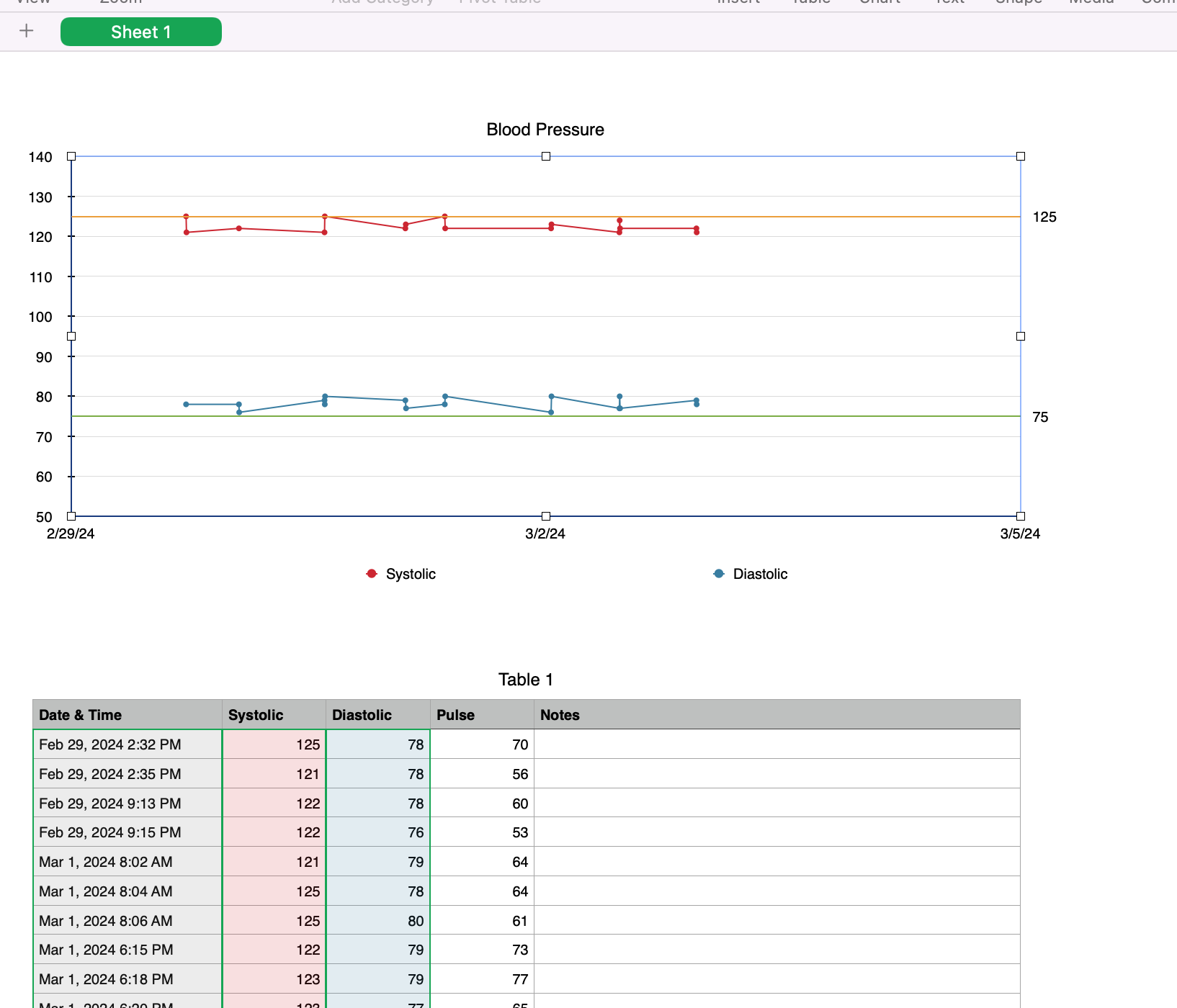 Does anyone know of a template for numbers where time, blood pressure and heart rate can be recorded and displayed on a graph?