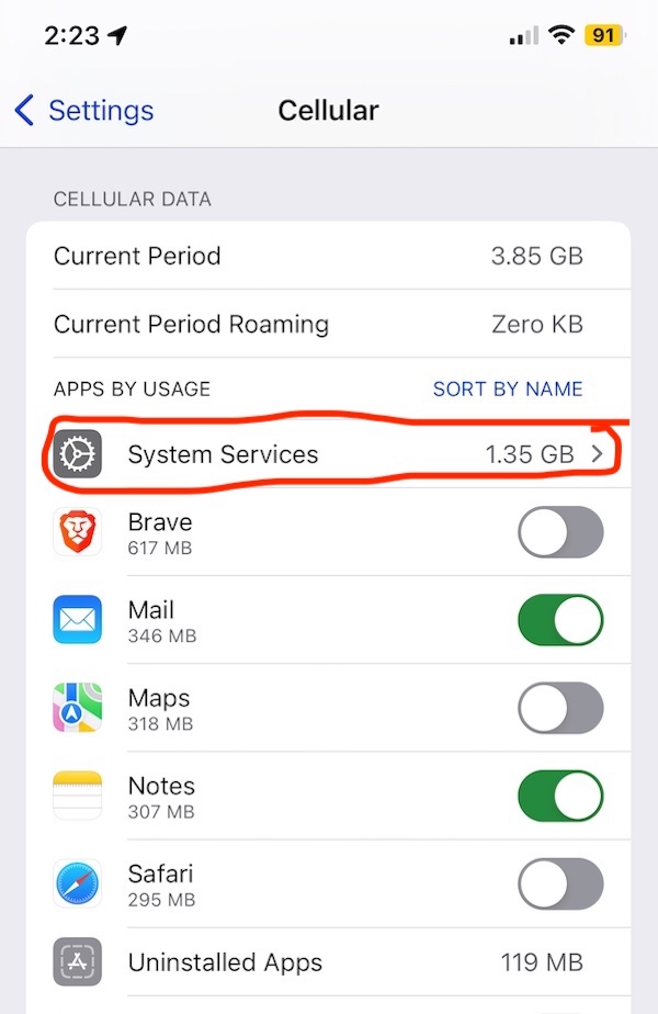 Under Settings, Cellular, CELLULAR DATA, CURRENT PERIOD, Apps by Usage, System Services, tap the ">" at the right edge, and you'll see exactly which Apple System Services are using data and how much. CURRENT PERIOD is the time elapsed since Cellular Usage Statistics was reset.