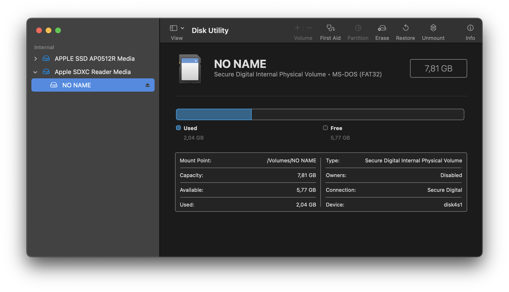 a) Make a byte-to-byte backup of the card. Switch the card adapter to Lock mode to prevent any data from being written to your SD card. Open Disk Utility: