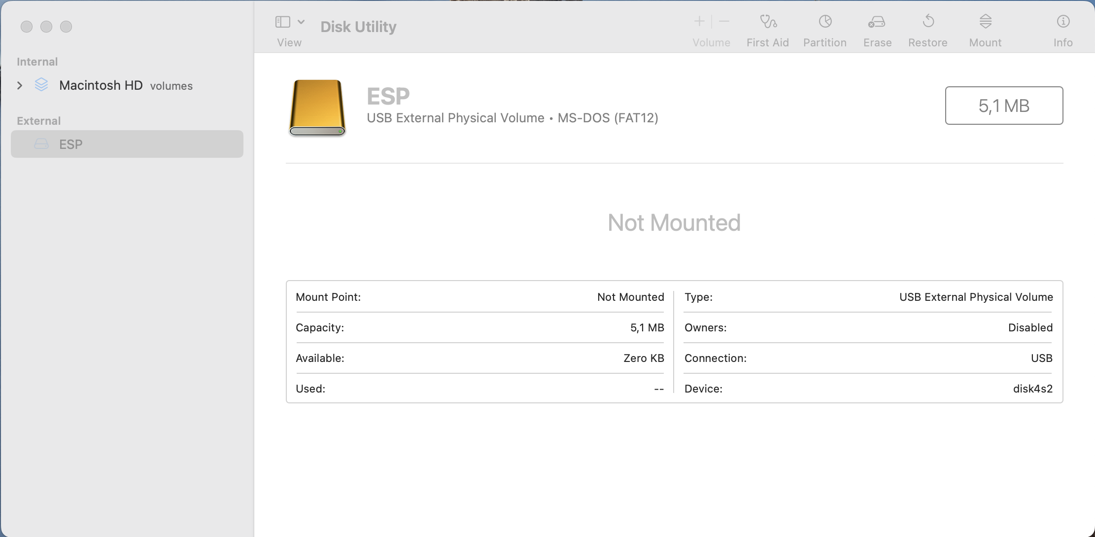 Hi, I have the following situation: I created a bootable flash drive for linux ubuntu with the program balenaEtcher. After that I needed to use this flash drive as a media for files, when I inserted it into my macbook on the desktop it is not displayed, the disk utility shows the media with the name ESP and capacity 5,1MB although the actual capacity is 128GB (see screenshot), formatting it through the utility did not work, I tried again to burn the installation disk through balenaEtcher in the hope that the mac will see it, but this also did not help. Please help me, maybe there are some options to force reset it and format it via terminal or other program