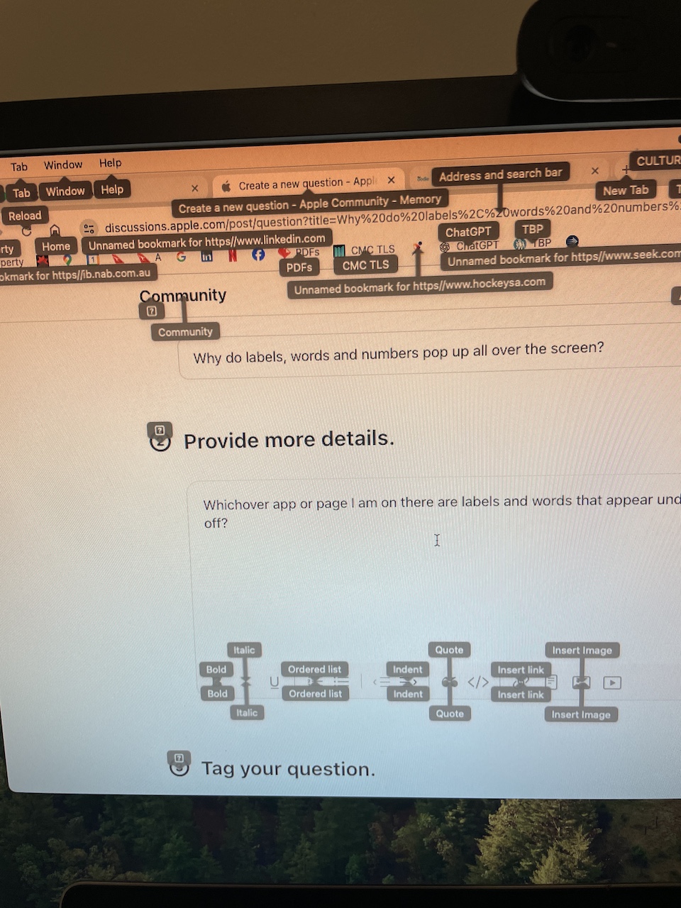 Why do labels, words and numbers pop up all over the screen?