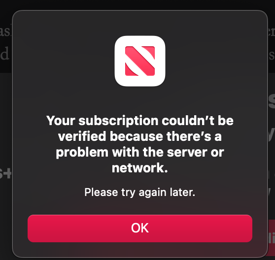 > Your subscription couldn’t be verified because there’s a problem with the server or network.