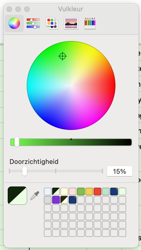 In Numbers there is the option to pre-set fill colors so that cells can be filled with a pre-set color easily, see the picture.