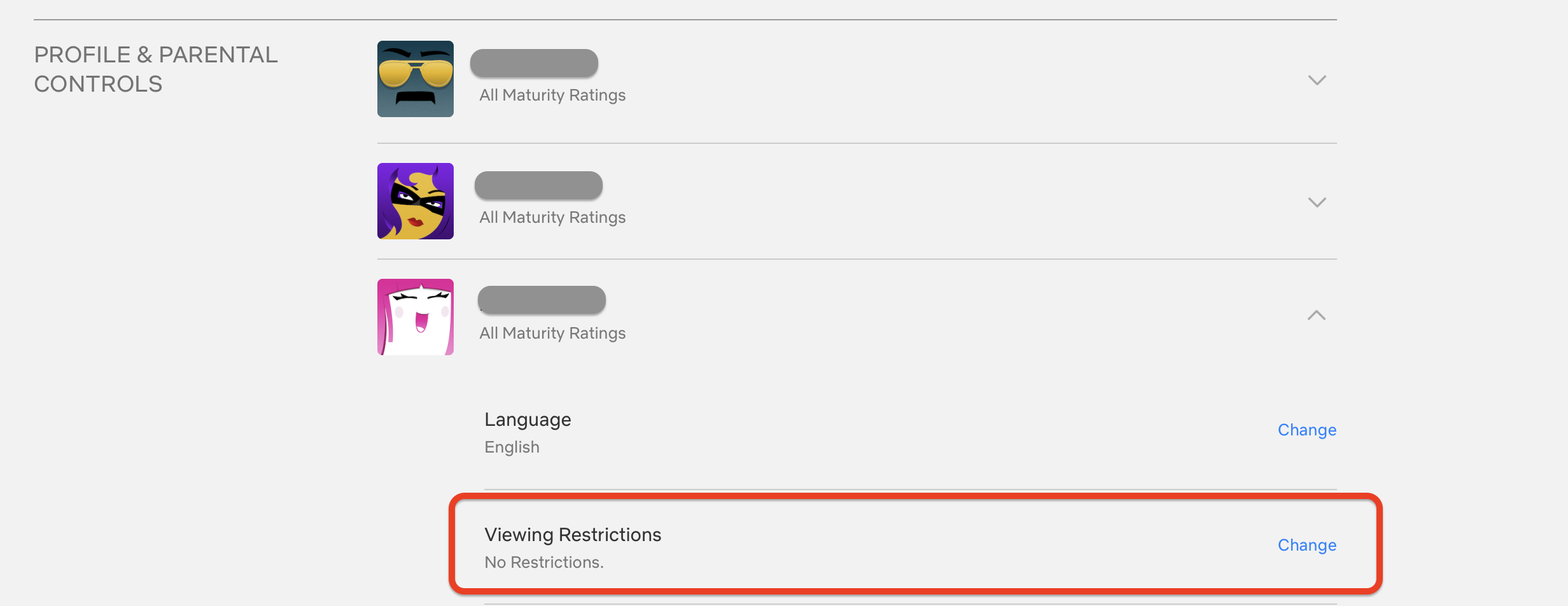 In the resulting page, open the "Profiles & Parental Controls" section and select your child's account: