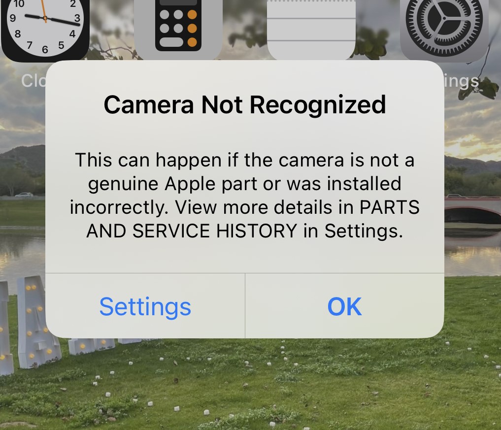 I tried a hard reset by pressing the volume up, volume down, then holding the power button until the phone turned off and the apple logo popped up. Once my phone restarted and I got to the home screen, I received an error message saying, "Camera Not Recognized" and in settings -> general -> about it states next to the camera "Unknown Part"