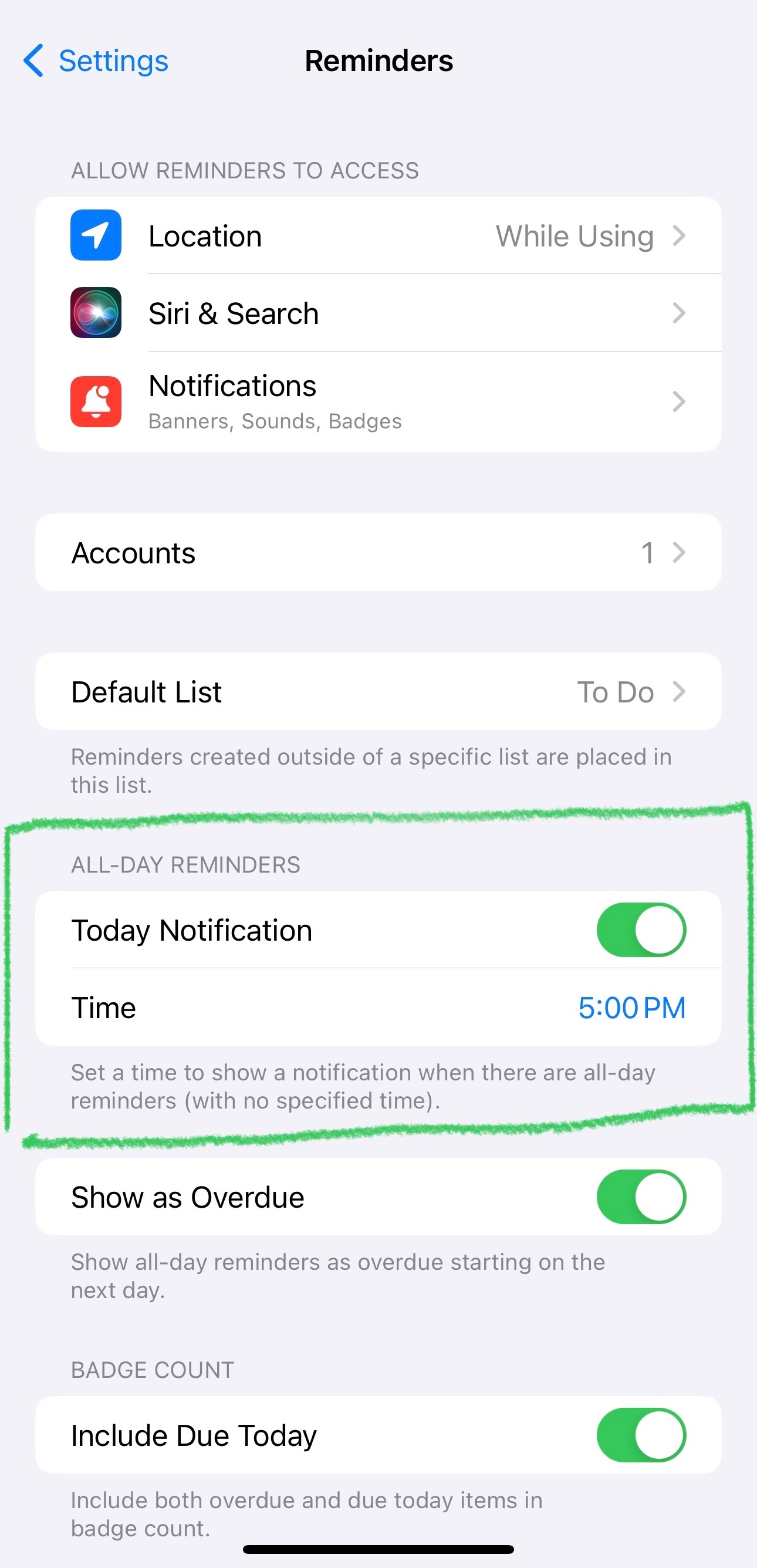 3.) There should be a section called “All-Day Reminders” where you can set a time to show all day reminders on your Lock Screen, set your preferences and your default list if you have multiple.