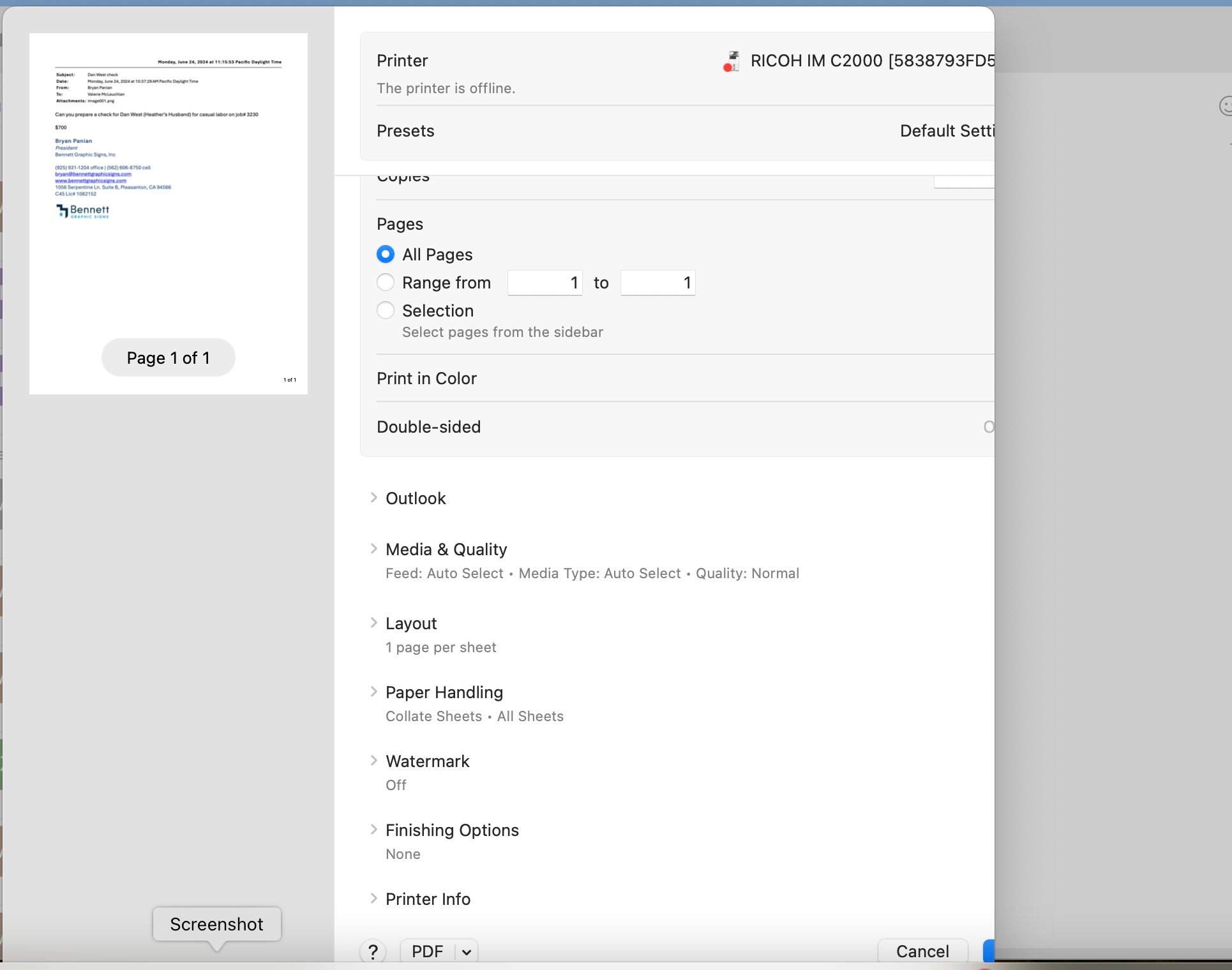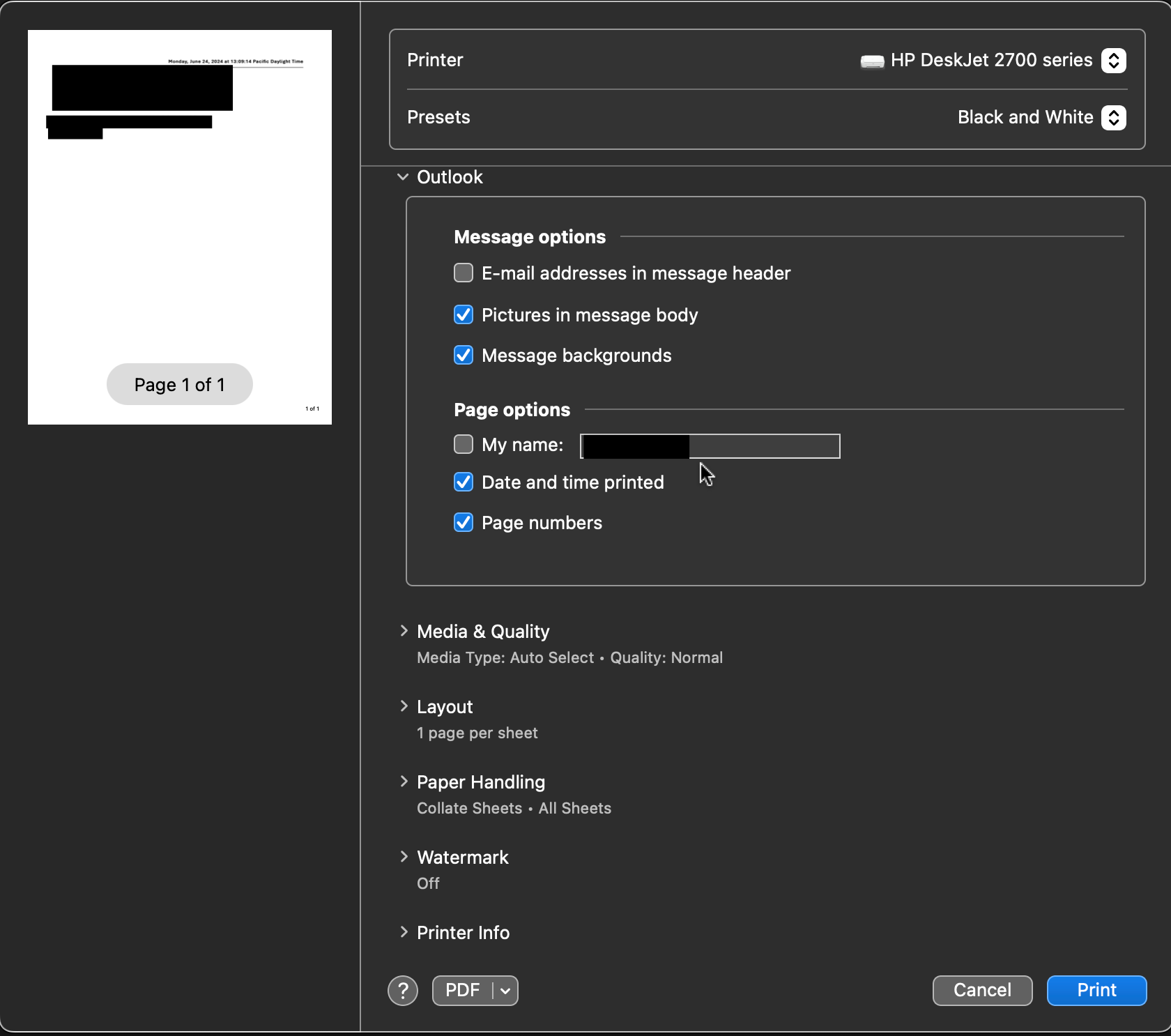 I just upgraded to Sonoma 14.5. In Outlook for Mac the print dialog box is cut off. The normal process for expanding a dialog box (hover on the edge until the arrow appears and dragging it) does not exist. There is no scroll box on the horizontal or vertical edges.