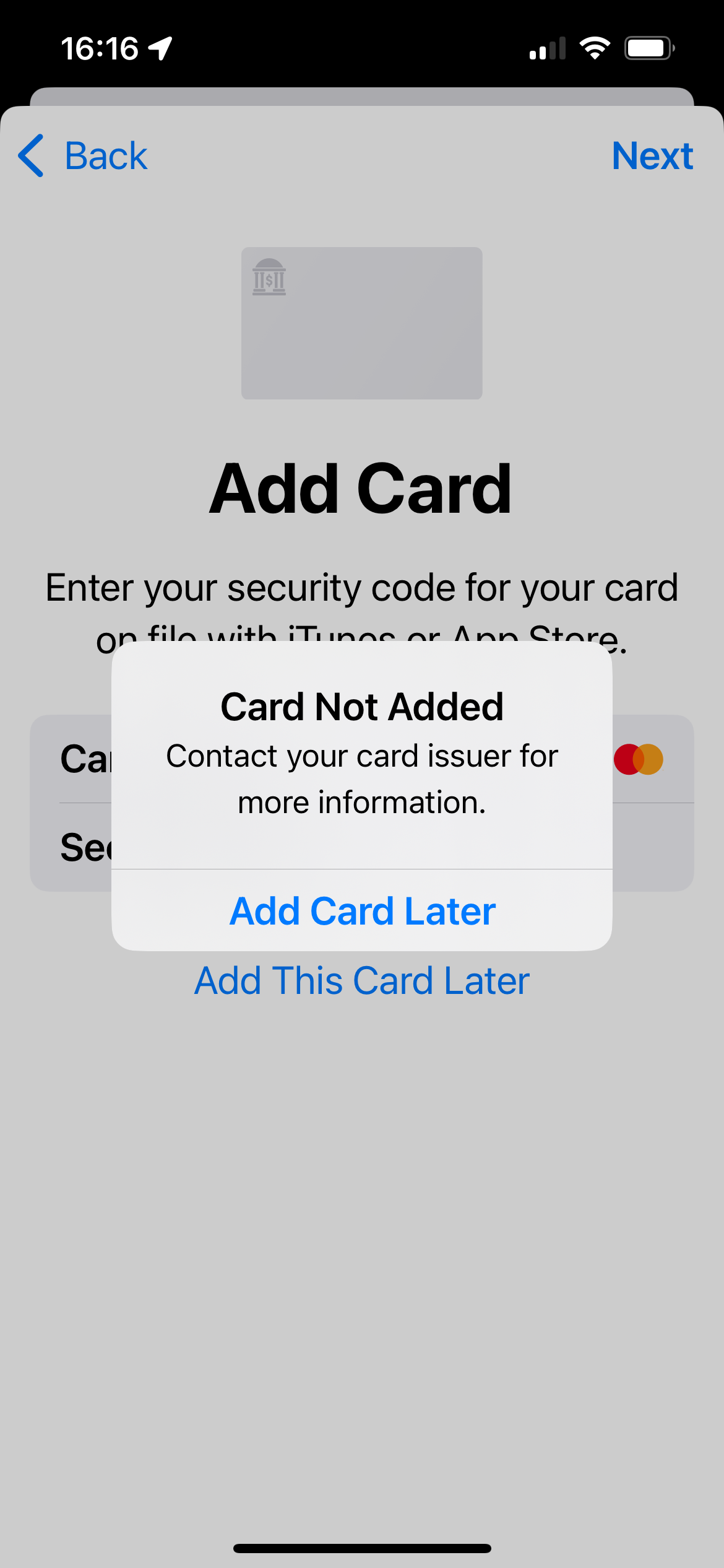I have been trying to add my cards for several weeks. I recently created 2 credit/debit cards. I was able to add the debit but then the credit stuck. I read some suggestions from people who suggested I turn off the pass code, remove all the cards, and add them again. And now the debits of the old card which is already in the app plus the new credit one are all not working at once. I tried many other cards from different card issuers and received the same message so this definitely not the bank problem.
