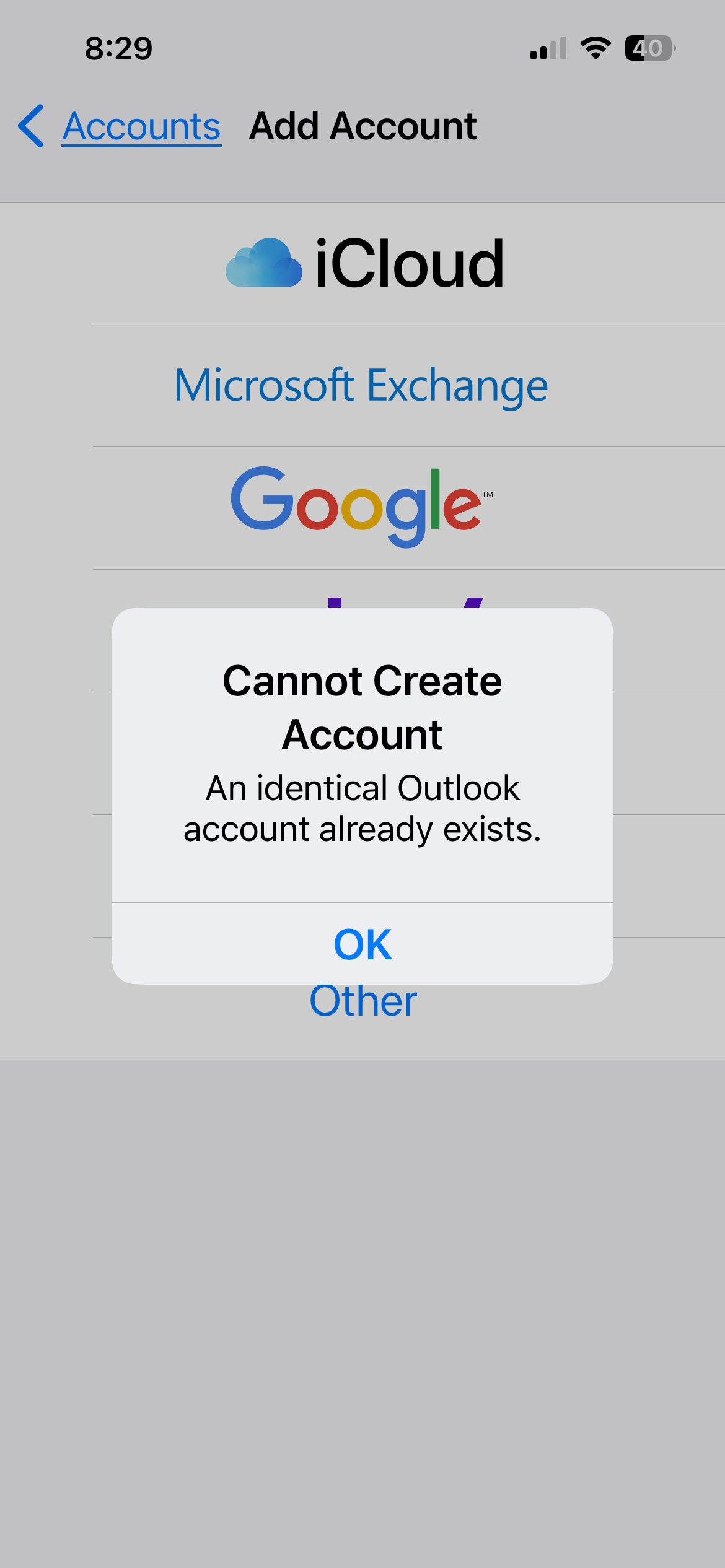 On the iPhone, the last Hotmail account I attempted to add in the Mail app using the Outlook option(and of course it’s my main account), when I go to input the email address and then the password, I get a message saying “ Cannot create account. An identical Outlook account already exists.” This is the same process I followed when adding 3 Hotmail via Outlook accounts on iPad Mail app after these same 3 had been previously added to the Outlook for iOS app on the iPad. On the Outook for iOS app on the iPhone, these same 3 Hotmail accounts had been previously added, and 2 of these same Hotmail via Outlook accounts had been successfully added already to the Mail app. It’s only that very last one I attempt to add that consistently gives me that “ account already exists” message. Any ideas on how to fix this? Thanks