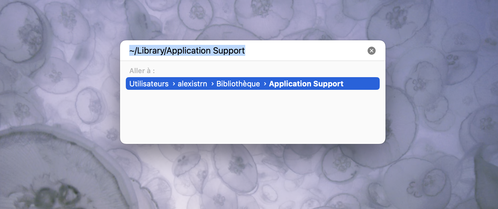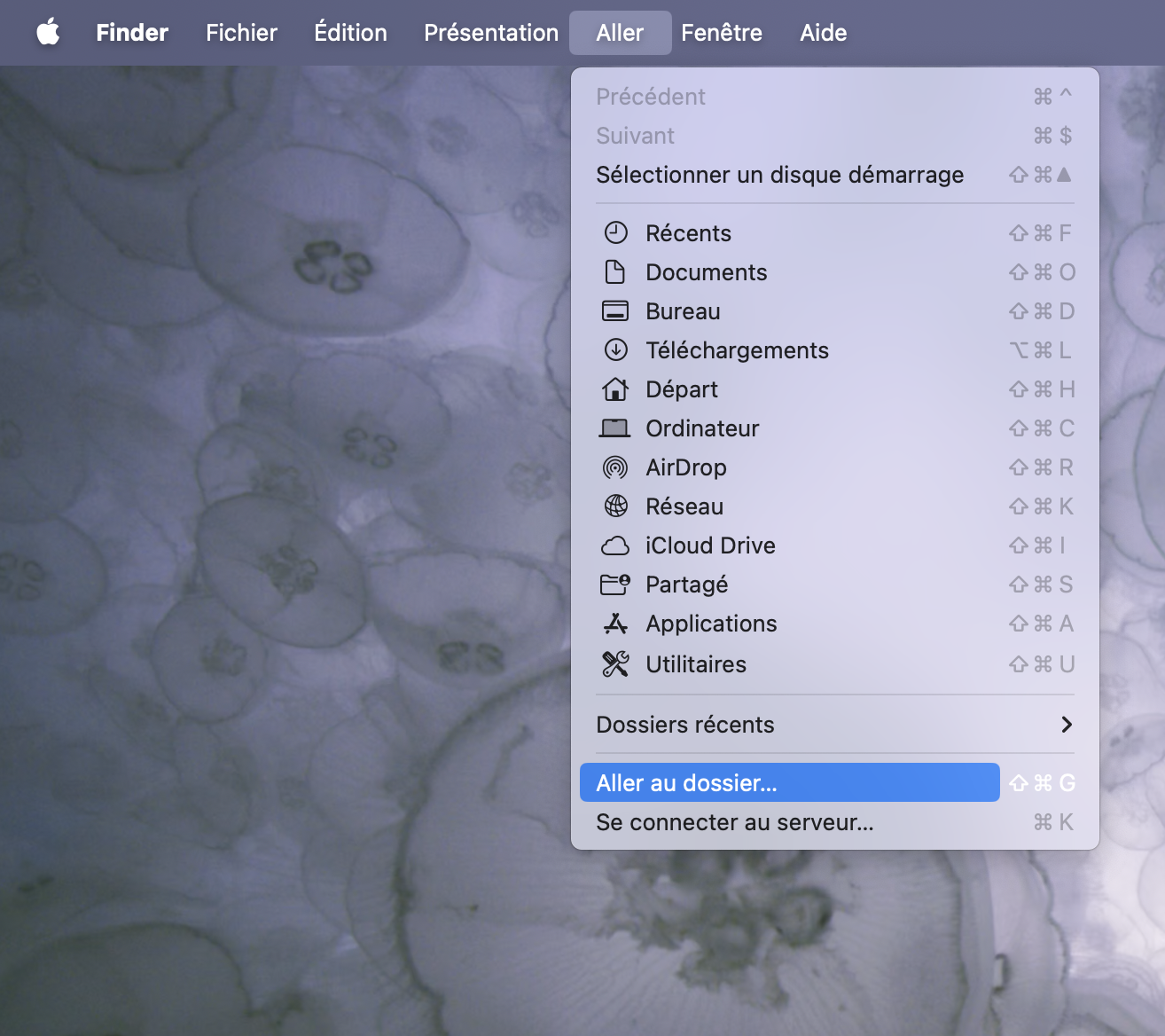 • Depuis le bureau, utiliser le raccourci SHIFT+COMMAND+G ou se rendre dans le barre de menu, dans aller > aller au dossier.