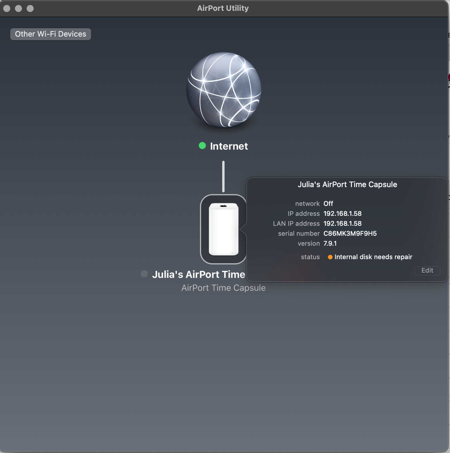 An AirPort Extreme is a router only.......it has no built in hard drive. If the product that you are calling an AirPort Extreme has a built in hard drive, you have a Time Capsule.