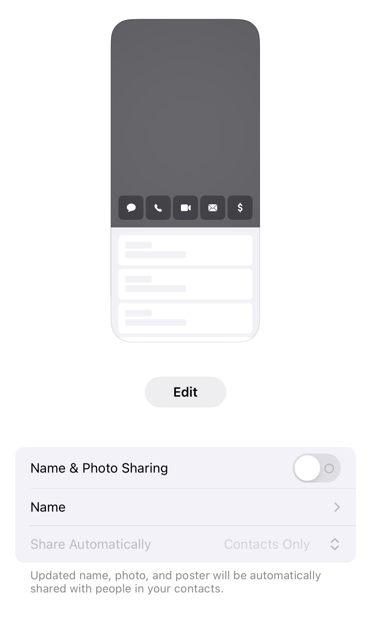 my family of 4 shares an apple ID. the contact name and photo from one of our phones is automatically shared with everyone who contacts any of the 4 of us. when we look in settings > contacts > share name and photo, the option is turned off, but there is a option that says "share automatically" and is greyed out (unclickable, as shown) and displays "contacts only". how do we change this and stop it from sharing one person's contact from all of our phones?