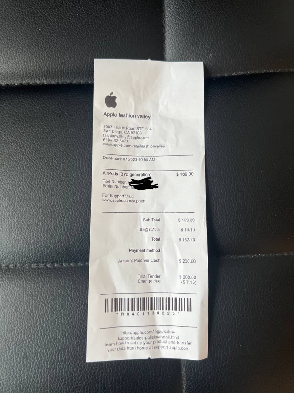 ... and an unidentified “someone else” purchased the genuine AirPods for cash in San Diego last December.