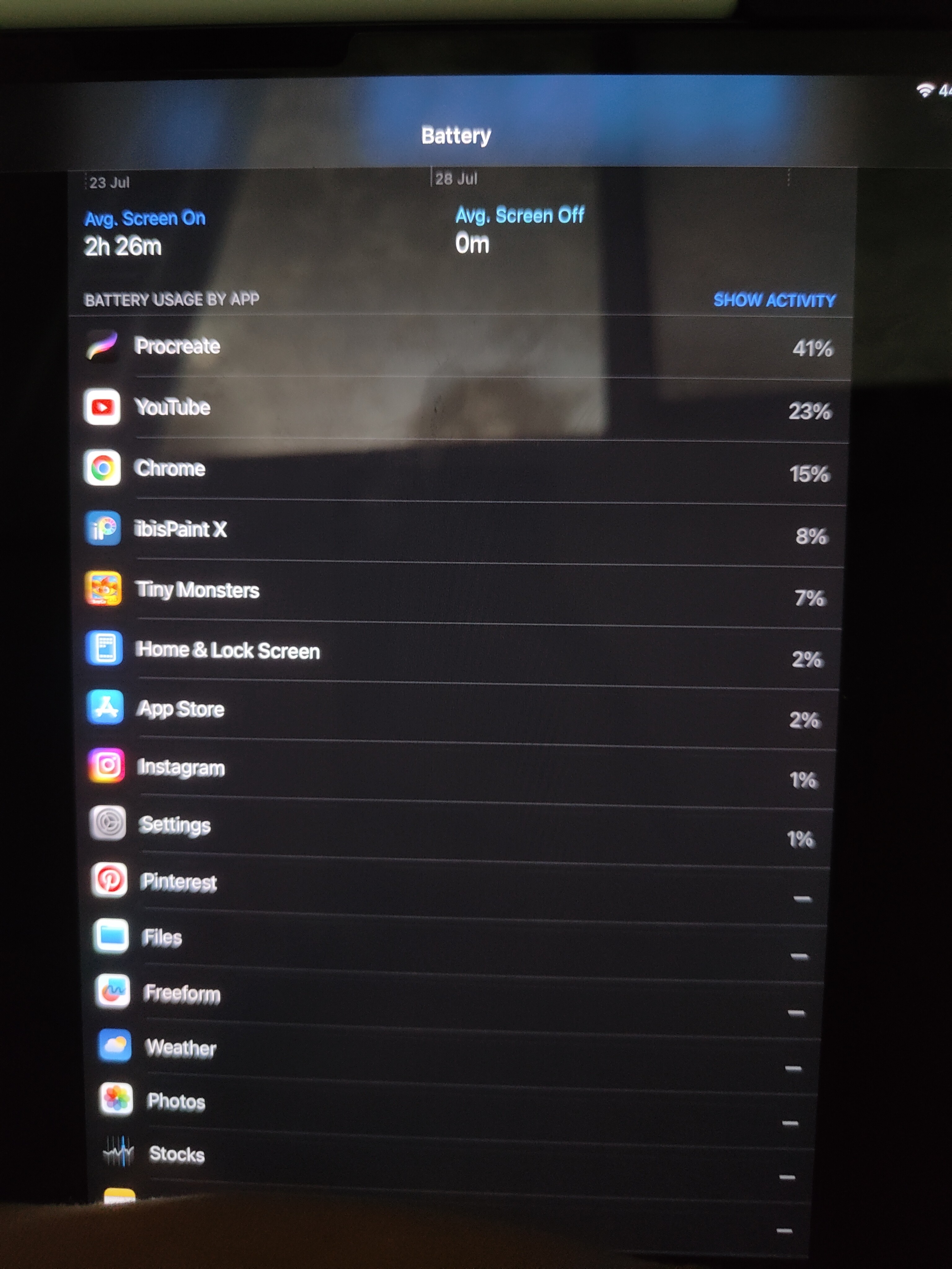 i just got the new ipad pro m4 for around a month. not long after i got the ipad i realized the battery drains quite quickly ( around 2 minutes per 1% on drawing app and i would say the drawing app i used isnt exactly the heavy type ) this worried me and i decided to ask around couple of my friends who also have ipad and most of them said theirs dont drain that quickly. so i searched around and someone suggested to restart the ipad and it does help its been a week or so since then but then it started to drain quickly again for no reason. (all background apps permission are blocked so none of the apps have the permission to run in the background and i only open drawing app without anything else not even other app "tab" is open i always make sure to close all app tab b4 drawing) im wondering if theres some kind of problem to my ipad i already made sure by asking several ppl (yes they also use their ipad for drawing) and they all said its not suppose to drain that quickly what worries me is that it got fixed for a bit by restarting it but now its back and its only been a week or so. is there any ideas of why this is happening? should i take my ipad and get it checked?