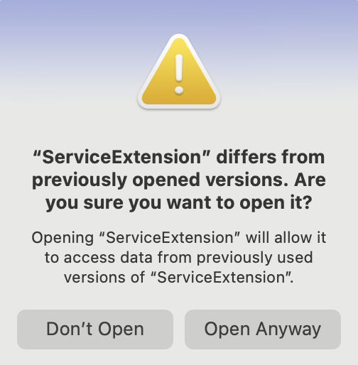Recently I started getting the above warning indicating that a "service extension" differs from the previously opened version. However, the dialog does not indicate which extension it is or what application it is linked to. Thus I always opt for not opening it.