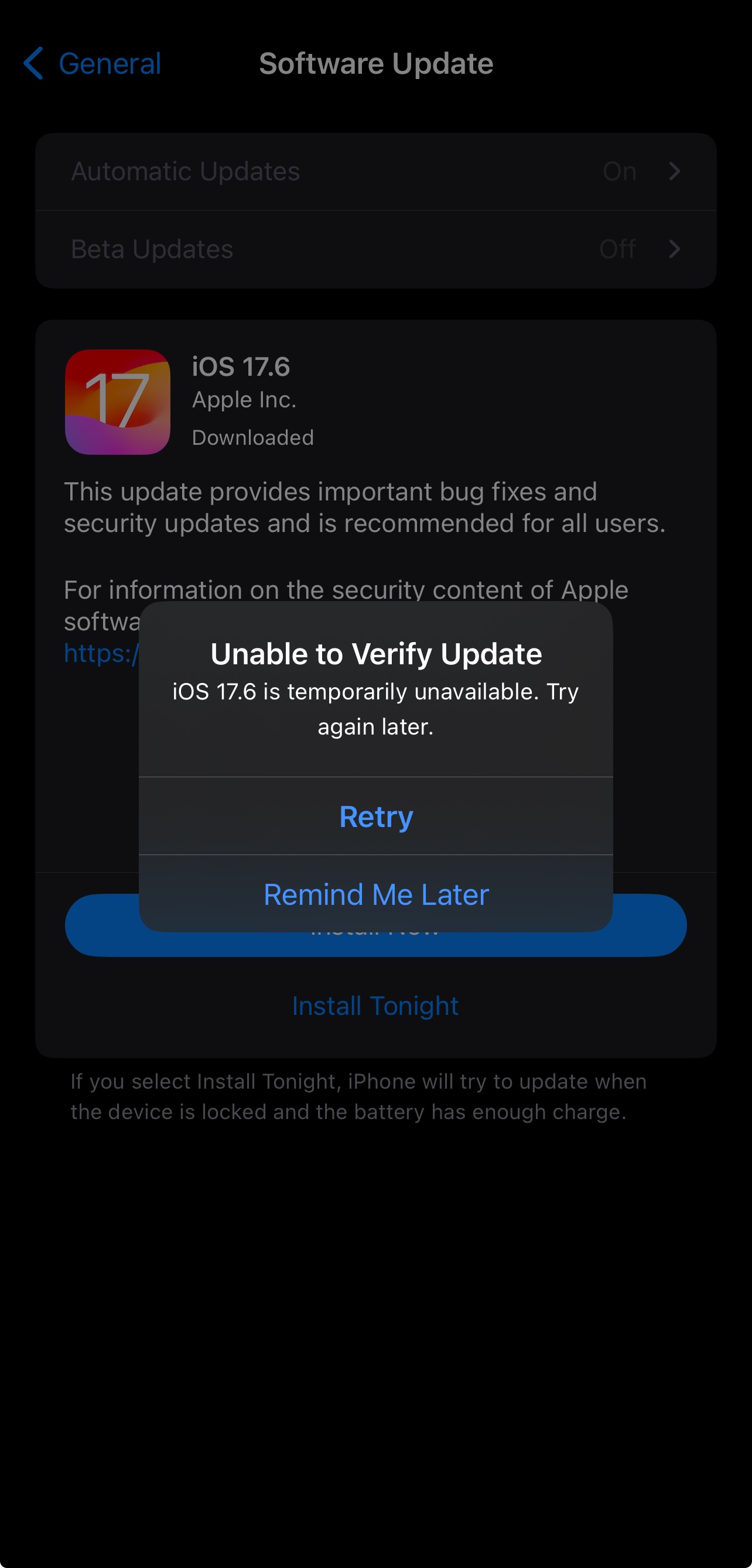 I can’t update to ios17.6 can’t verify also I did reset my network still the issue