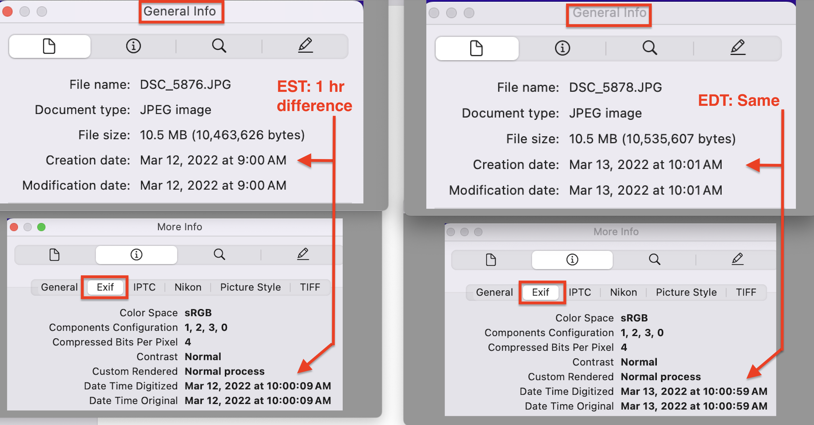 Attached are screen captures for photos taken on March 12, 2022, the last day of EST, and March 13th, the very next day and the beginning of EDT.