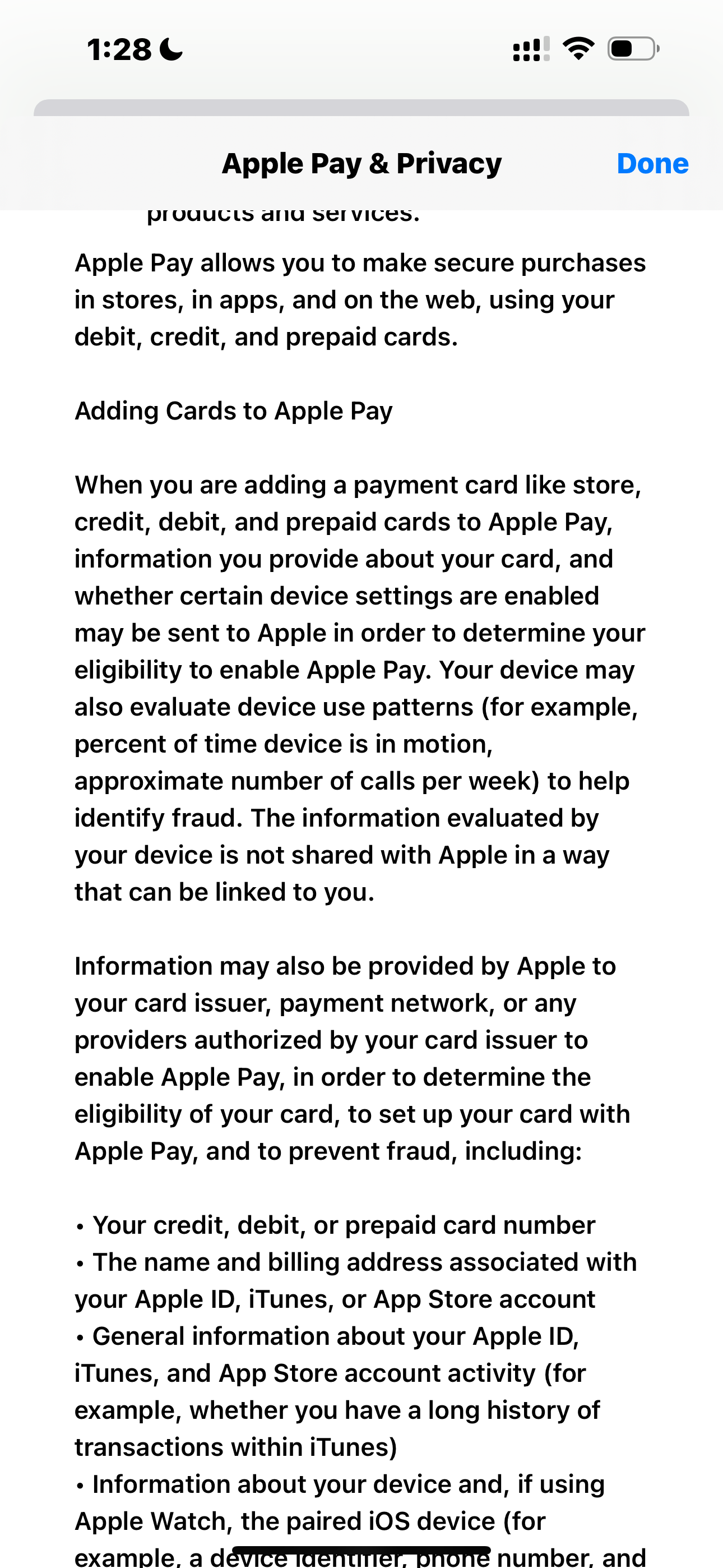Apple provides some information about your Apple ID, Apple App Store and iTunes usage, iPhone location and usage of iPhone. The information is supplied anonymously. As part of the Apple Pay terms and conditions you agreed to share the information with your banks.