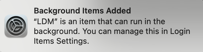 I've begun to see a popup message when I restart my MacBook Pro (running Sonoma) that says "LDM is an item that can run in the background. You can manage this in Login Items Settings." But what in the world _is_ LDM? It's not in the list of Applications on my Mac. I have no idea what it is, whether I want it on my computer, whether I should disable it running in the background. Would greatly appreciate knowing what LDM actually is, please.
