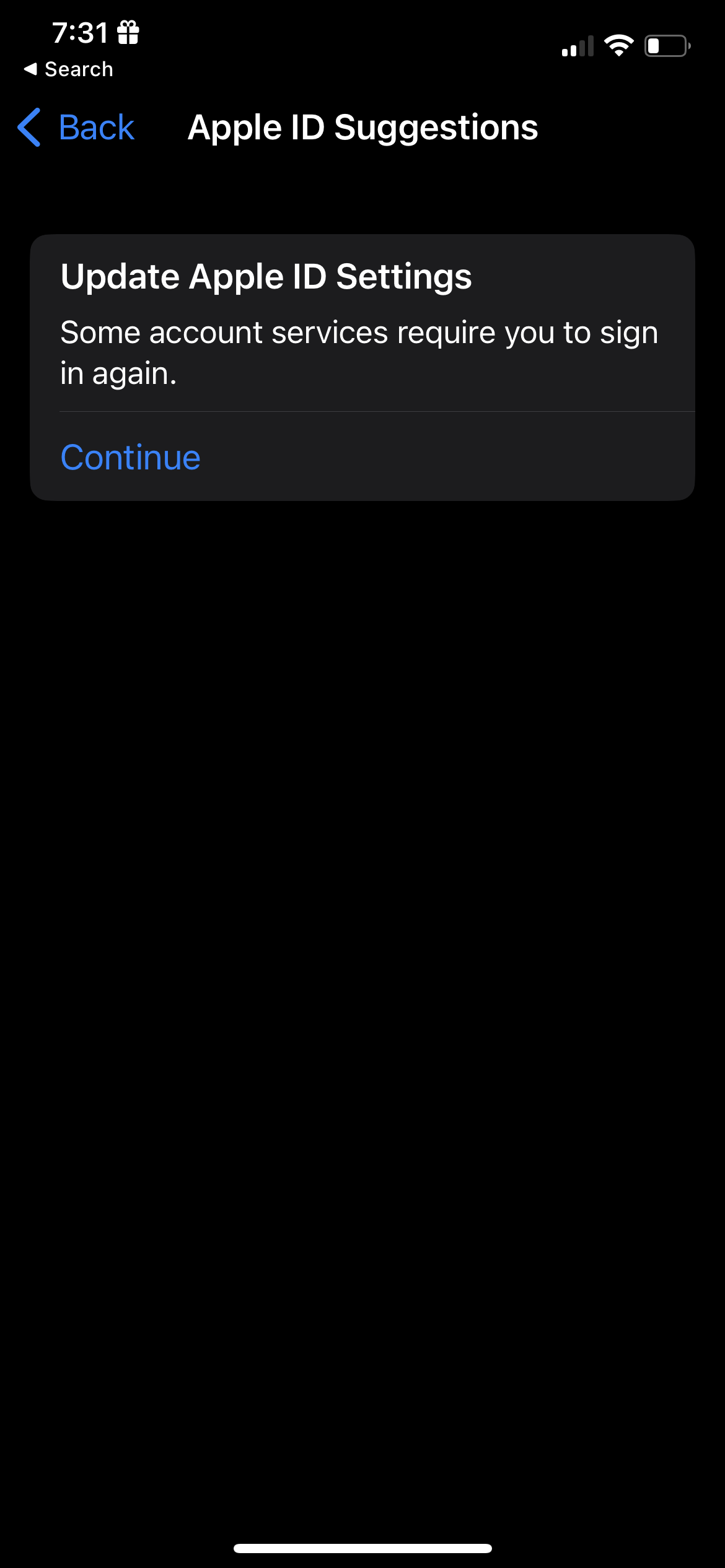 "Update Apple ID settings not working: I decided to update my Apple ID settings as me slacking on doing it has been a problem, and has affected me by logging me out of lots of my apps, as I entered the settings app and opened the “Apple ID suggestions”, I saw the button to enter my password and log in, but whenever I enter my password it just bring me back to the same page as if I never entered it??"
