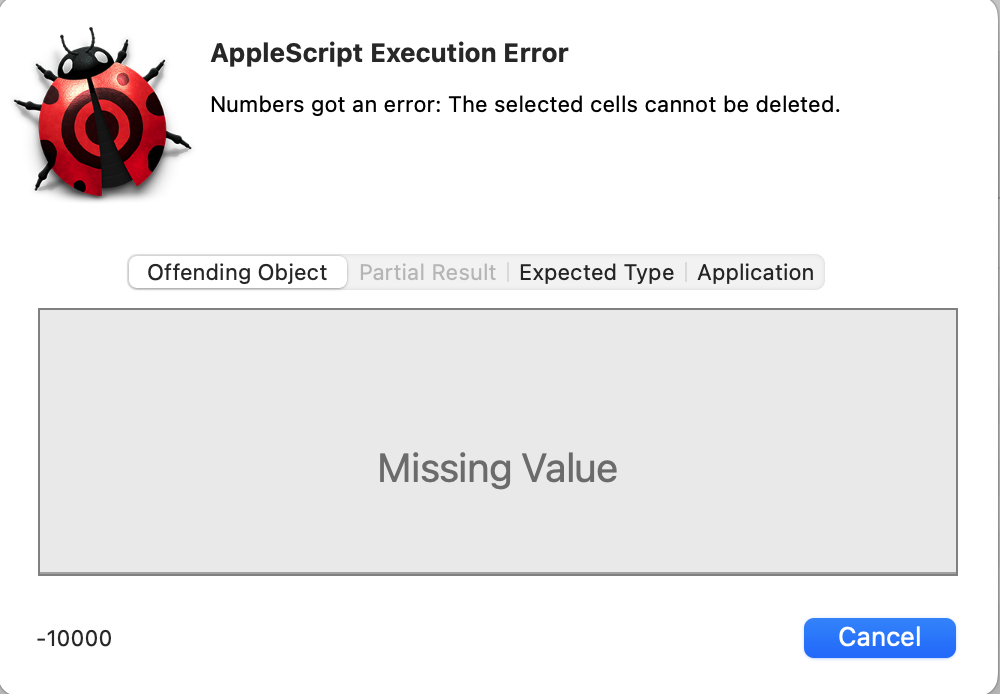 I have a table in another sheet with 4 columns and 434 rows. I need to populate 168 rows during an initialization step (same script as above). I am under the impression the only way between AppleScript and Numbers is to stuff cells one at a time. I figured out a mass erase can be accomplished by merging this block of 4x434 cells and clearing the value at once, then unmerging the cells. That works.