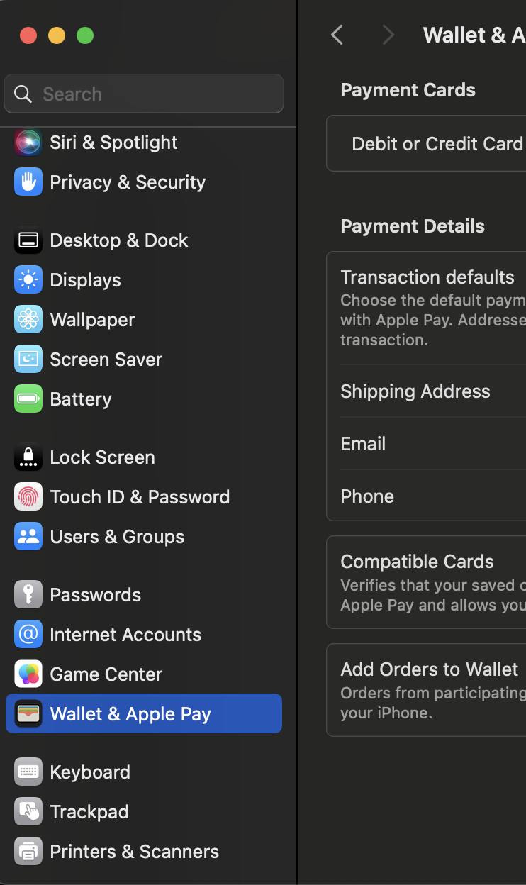 Wallet and Apple Pay under system settings shows old emails with no option to delete in dropdown menu.