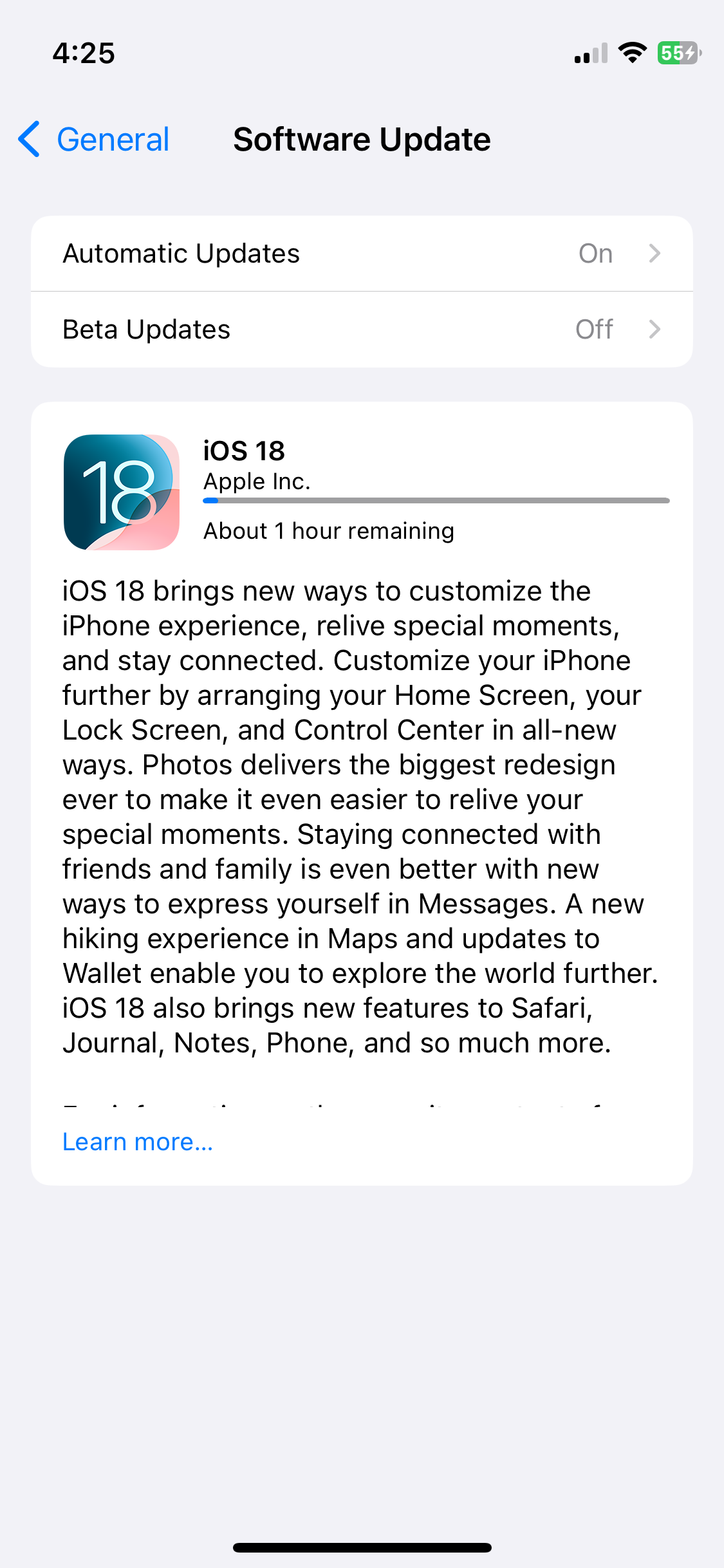 How do I update apple I phone to iOS 18? My phone used to do auto upgrades when not in use & charged over night. I got a notice to upgrade to 18 & install now or tonight I didn’t want to do it till ready.