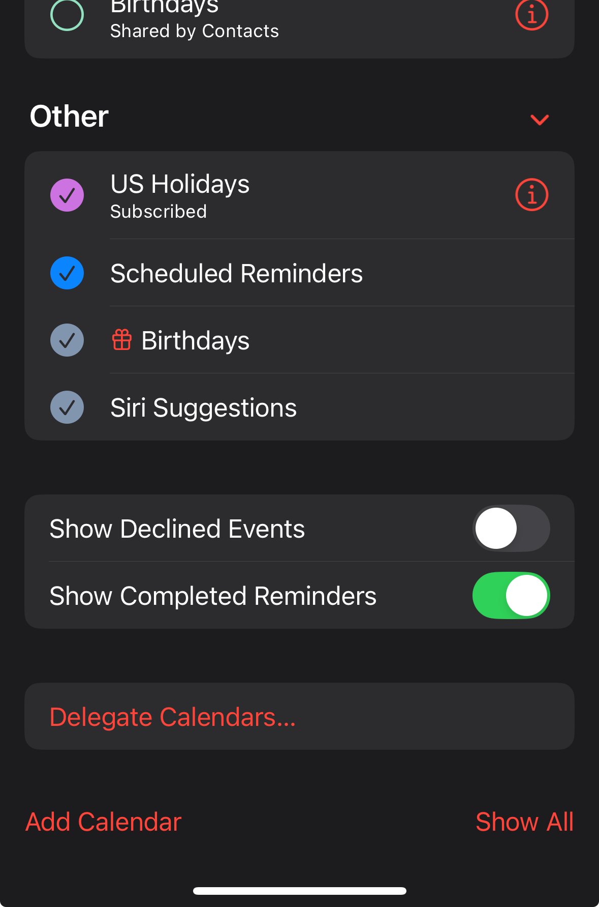 I went crazy yesterday trying to get the Reminders out of my calendar because everyone sent me to settings then the Calendar app within settings. That is wrong wrong wrong!. Just opened up your calendar with the app that’s on your home screen look at a month and at the bottom you’ll see the word calendar. Touch that and it will show you the different calendars. just uncheck scheduled reminders. That works.
