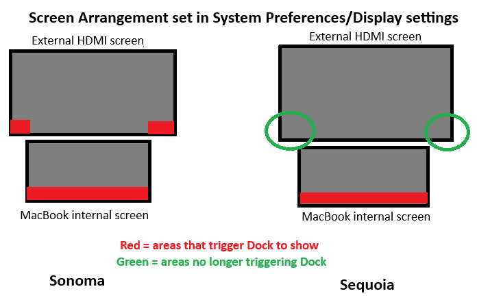Pre-Sequoia I could activate the dock in my external monitors as shown. Post sequoia, I cannot. I need to have the monitors arranged with one directly to the left and one directly to the right for the docks to be activated. Any arrangement above the built in display removes that functionality apparently. I can get by but it is a pain.