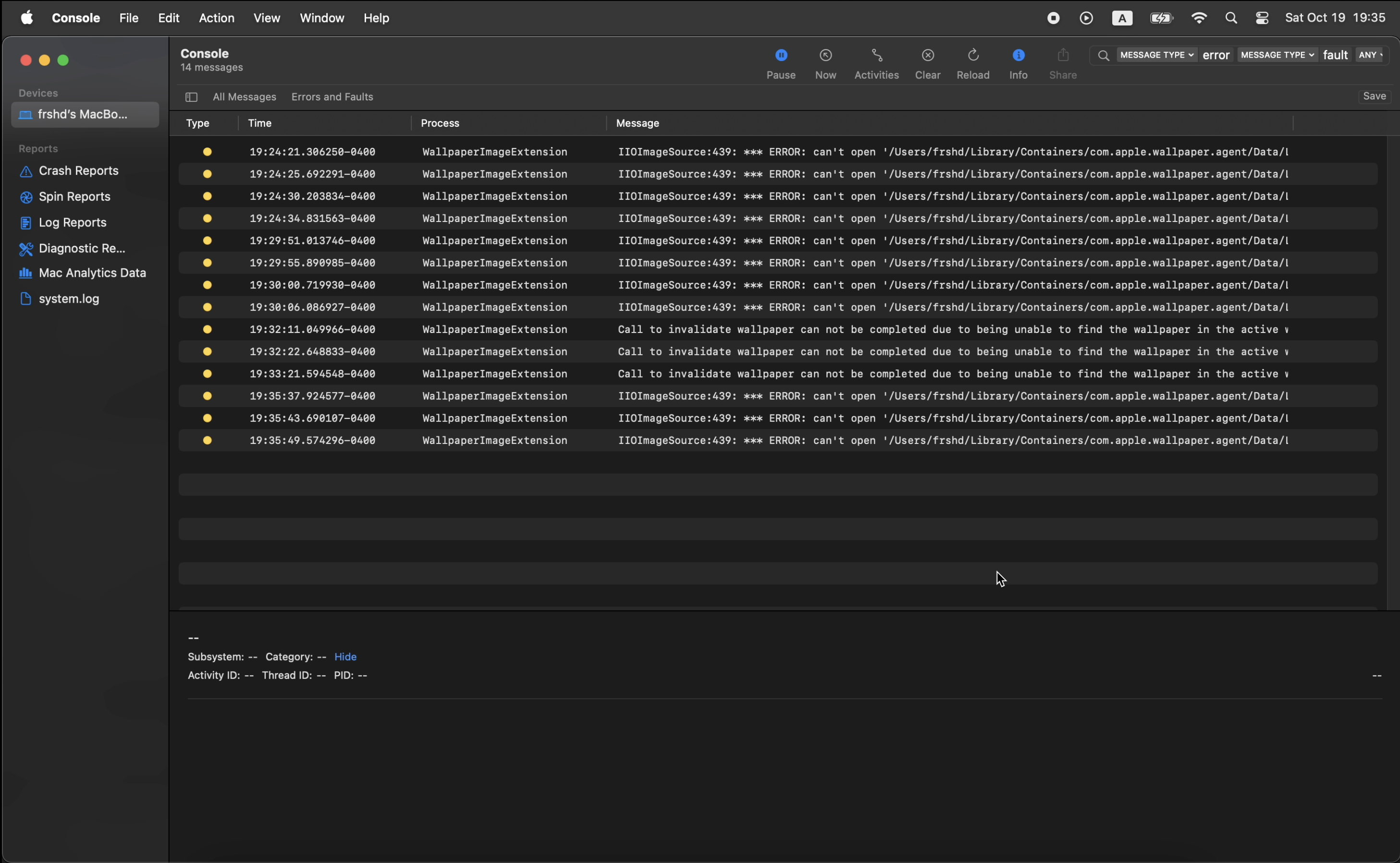 I opened Activity Monitor and waited for the screen flickering to happen. That’s when I noticed that the WallpaperImageExtension process was causing the wallpaper to restart—it was failing to find a wallpaper in its cache. You can confirm this yourself by opening Console from the Applications folder. Set the filter to "Errors and Faults" and search for WallpaperImageExtension. Every time the flickering happens, you'll see an error log pop up in the filtered list: