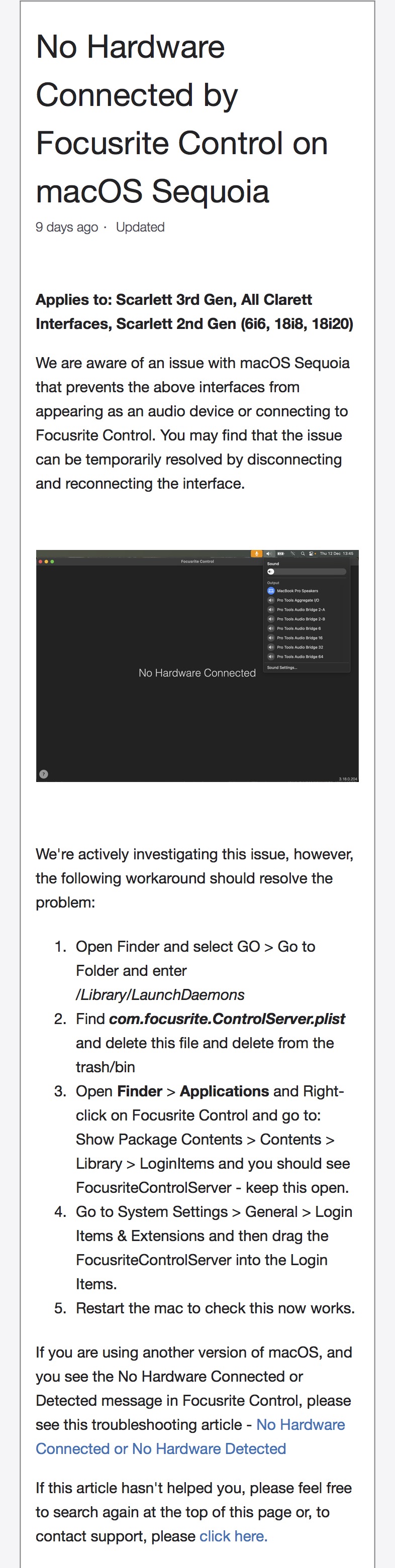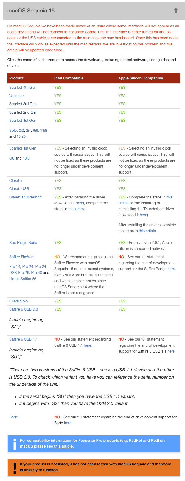 I have a Focusrite USB-C audio interface connected to a Mini which has been the case for several years. I use it both for recording and handling audio output from the Mini. Yesterday, I upgraded the macOS from Sonoma to Sequoia and discovered that the Focusrite was no longer automatically recognized by the Mini; instead I have to unplug then re-plug the USB-C cable into the Focusrite. This seems like a bug to me. Anyone else seeing the same?