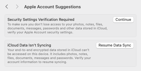 MacOS - frequent "security settings verification required" "confirm Mac password" and "Some iCloud data isn't syncing" messages