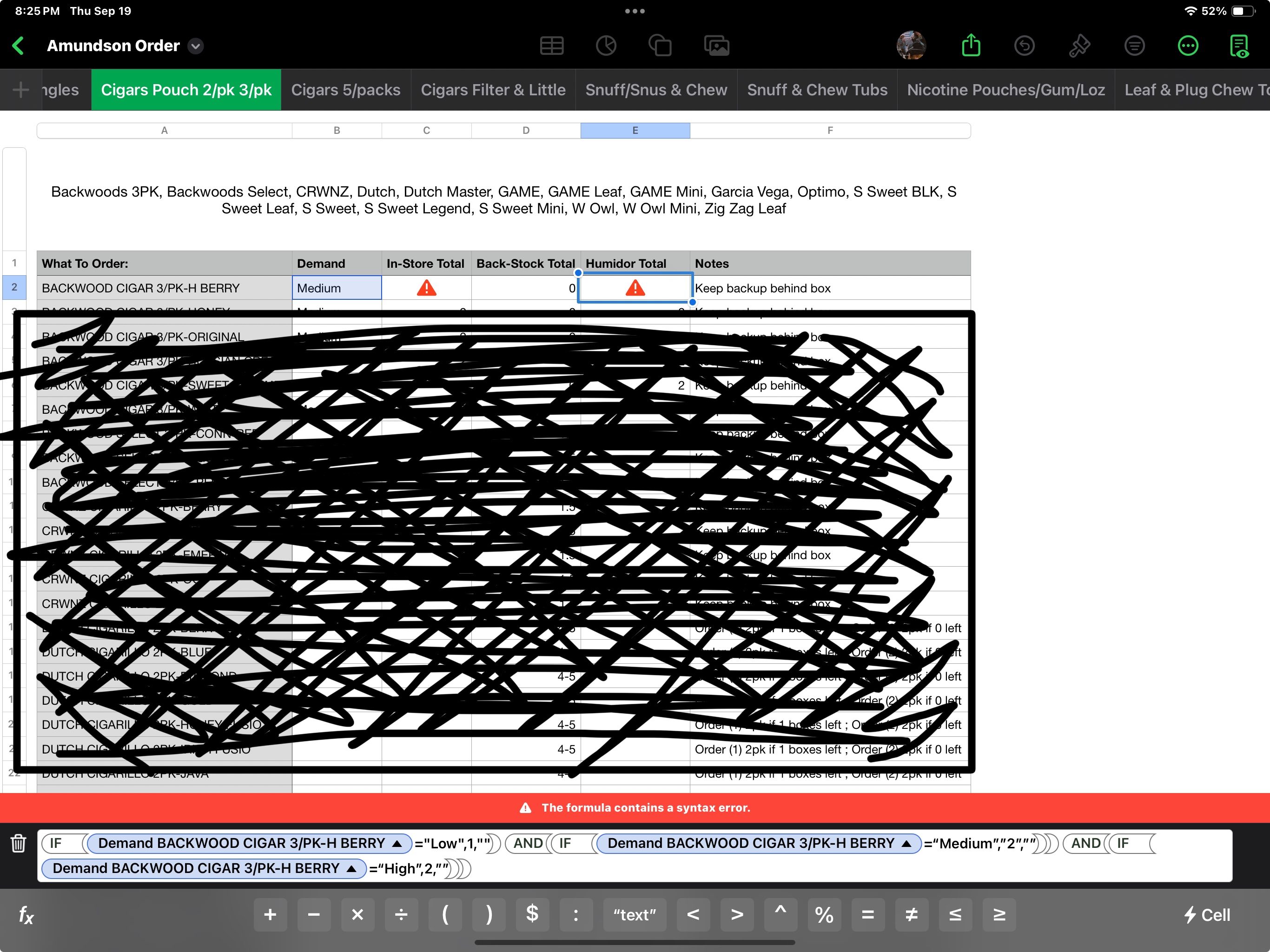 For simplicity and to shorten formulas (often very significantly), I recommend turning off the Numbers preference "Use header names as labels". Your cell "Demand Backwood...." will get its normal cell name of B2.