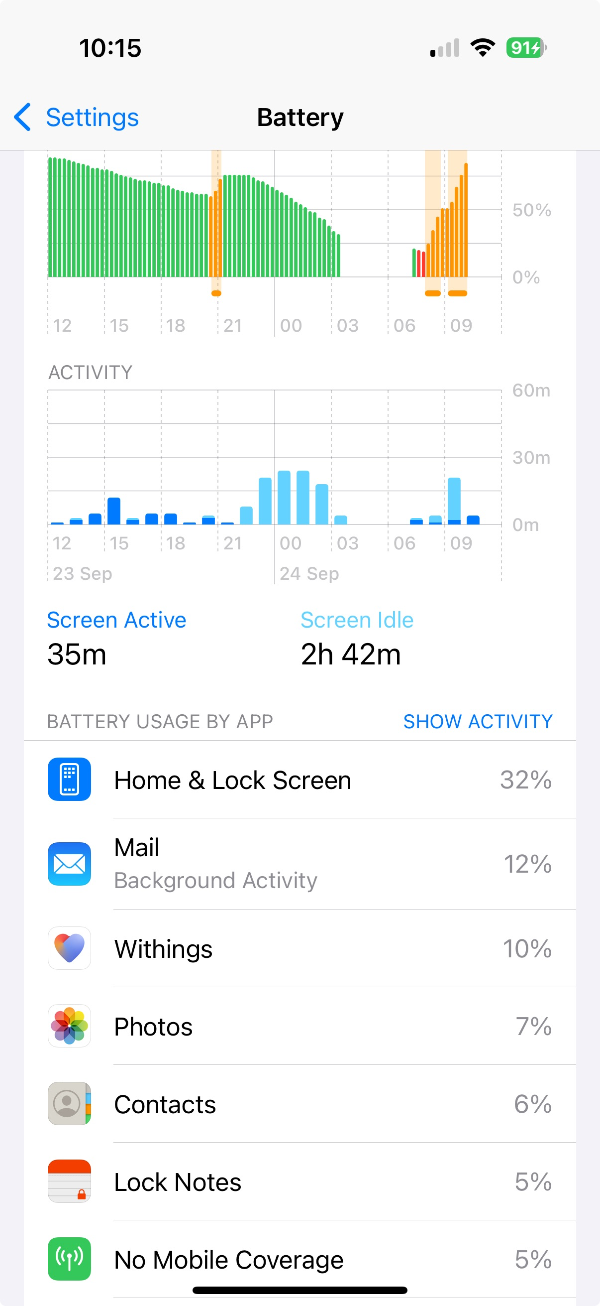 I’ve now made sure to stop a lot of apps from background refreshing when I don’t need them to, turned off location services for apps that don’t need it for my uses, also turned off the majority of the system services location tracking (used to have them off but apple turned them all on again, maybe with the ios update or perhaps due to changing my phone). I also turned off mobile data background refreshing and stuff like that so it only does it on wi-fi. For always on display, I turned off the wallpaper since I just want the information.