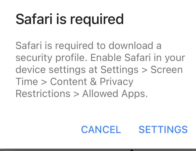 I visit the Safari app and login to my Google company profile but I am not prompted to download the Google Device Policy profile. I revisit Google Chrome and I receive the same prompt as seen above.