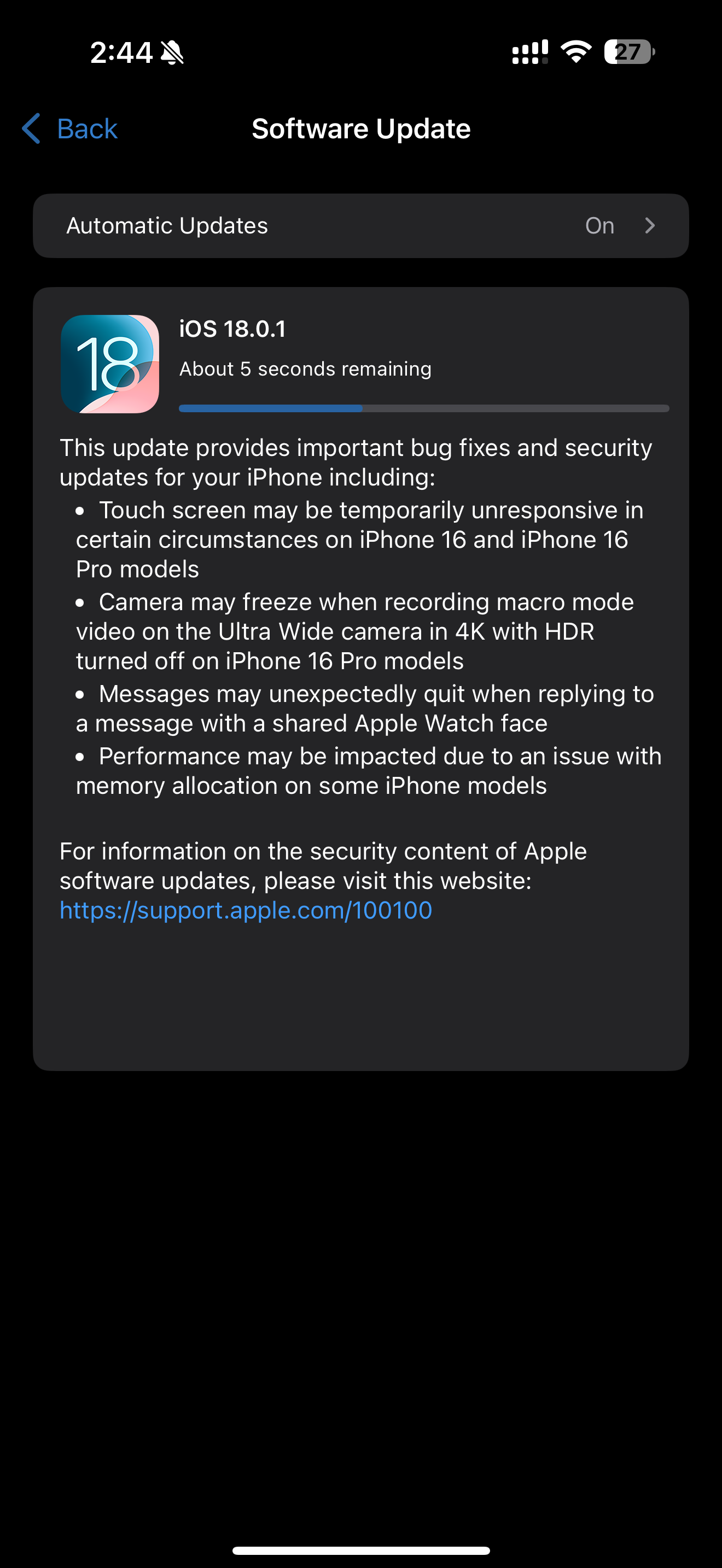 It is likely an iOS issue that will have to be addressed in a future update. When that update will come absolutely no one can tell you until Apple releases it. I personally haven’t had any issues so far on my 16 Pro Max but interestingly have had issues on my iPad Pro (M4) that has not been updated to iPadOS18 while the other same model iPad Pro that was updated to 18 hasn’t had any issues. We’re not yet at a week since the iPhone launch but a little over a week since iOS 18 released and surprisingly no clearly widespread issues seem to have occurred to cause at least one update to launch yet (iOS 17 had its first update 3 days after launch and the second one maybe a full week after for reference). Not to say that means it isn't an issue that exists for some or won’t be addressed in an update. Periodically check manually for an update on your iPhone….you might see it when it comes that way before you would know from here.