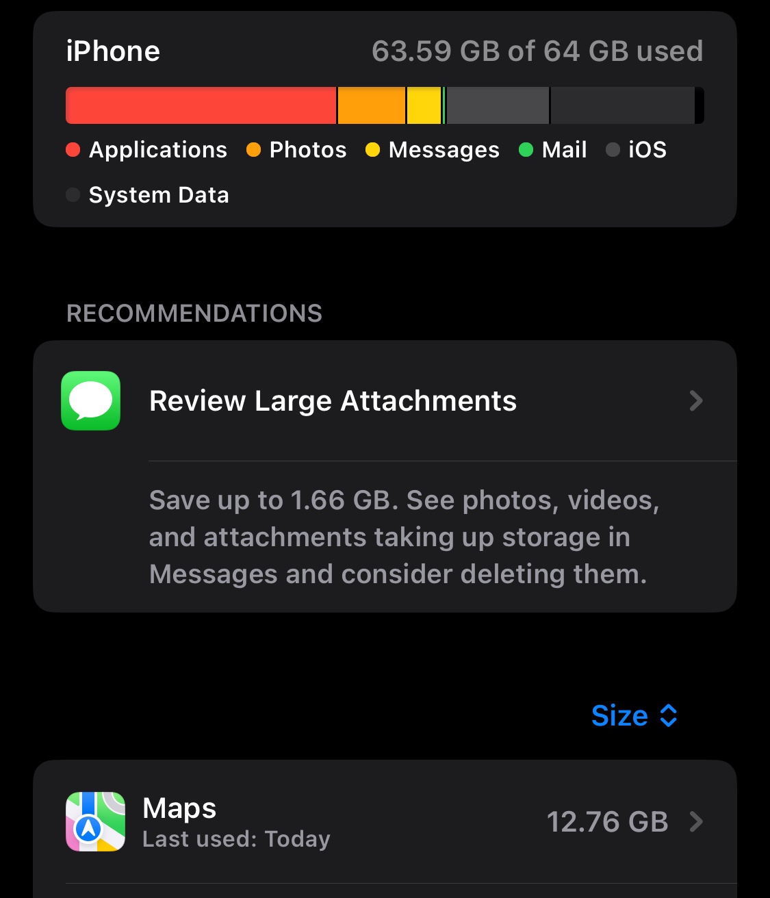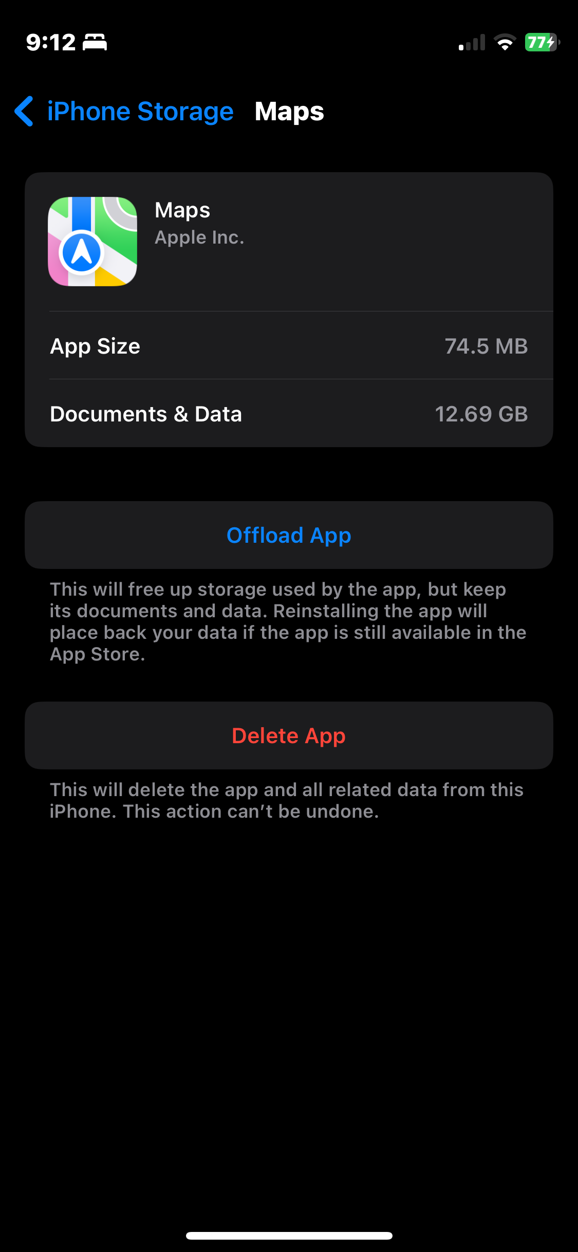 My iPhone 12 mini, with 64 gigabytes of storage is currently using 12.76gb of storage and gaining more and more storage usage everyday. I don't use Apple CarPlay ever which seems to be a frequent relationship to the high storage issue, and additionally, I do not have any downloaded maps, although it says the vast majority of storage is being used under the "Documents and Data" section. What is happening? I've tried deleting the app and it still used the same amount just with the offloaded symbol next to it. I've tried resetting my phone both with the app deleted and not. Nothing has helped.