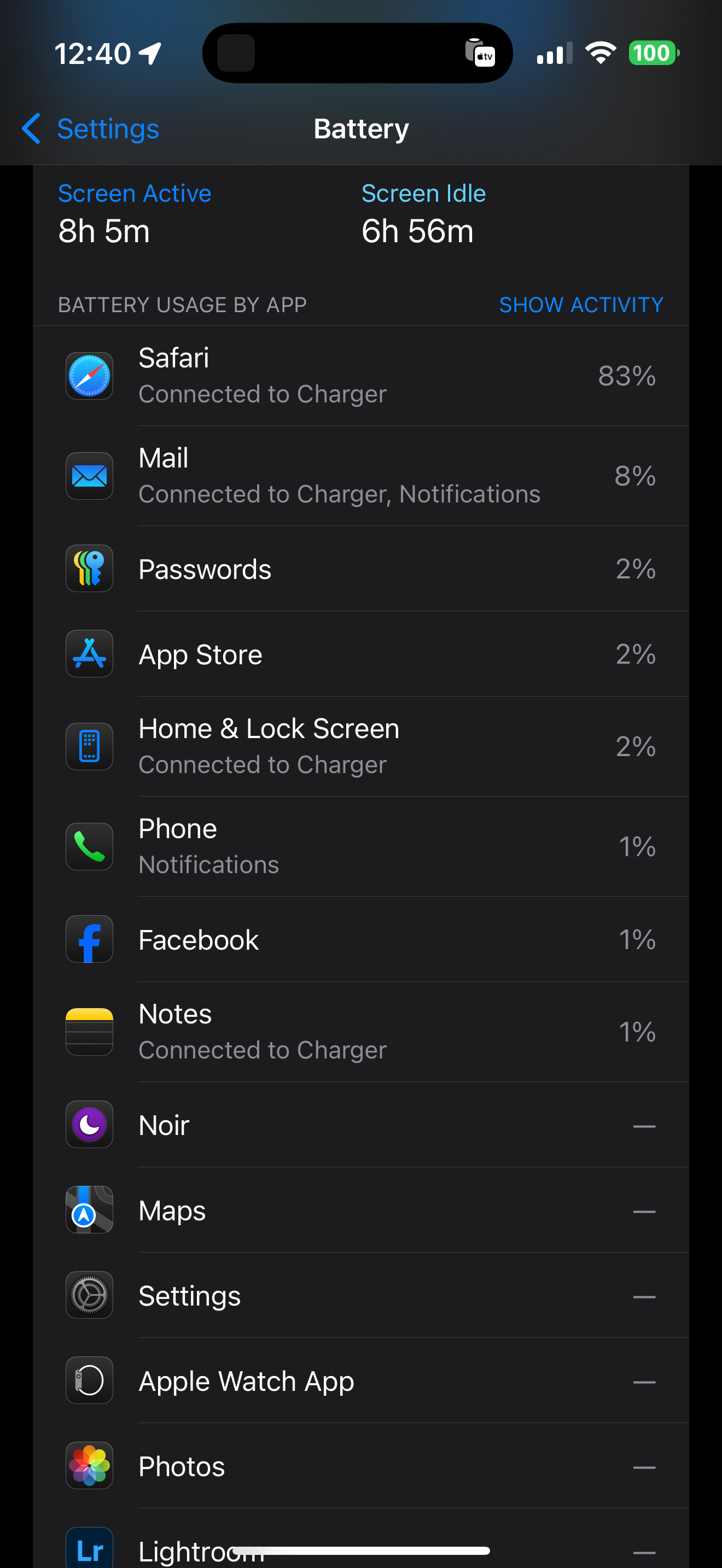 Turned off: 5G, AOD, background apps, location services, ets. When the phone is not being used, it consumes 1% per 30-40 mins.