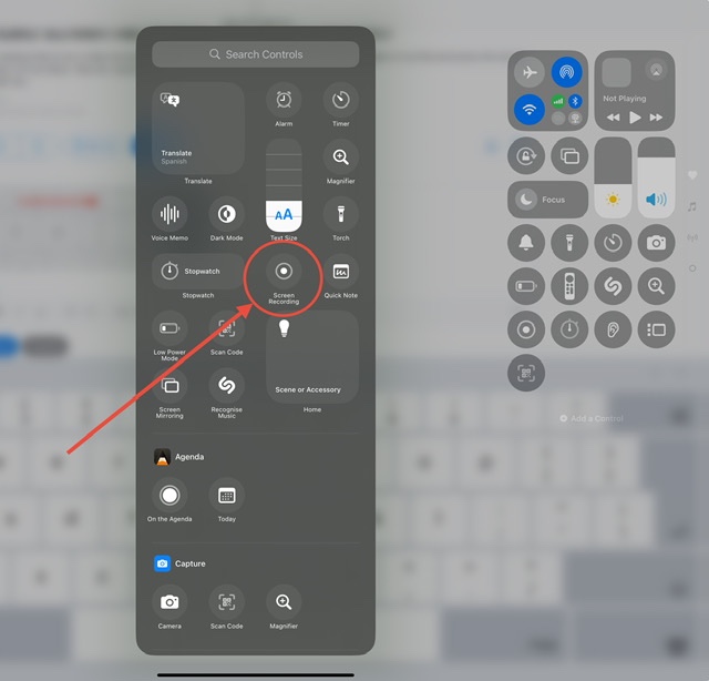 Next, select the Screen Recording button - then tap any clear area of the screen to finish adding the control to the Control Centre: