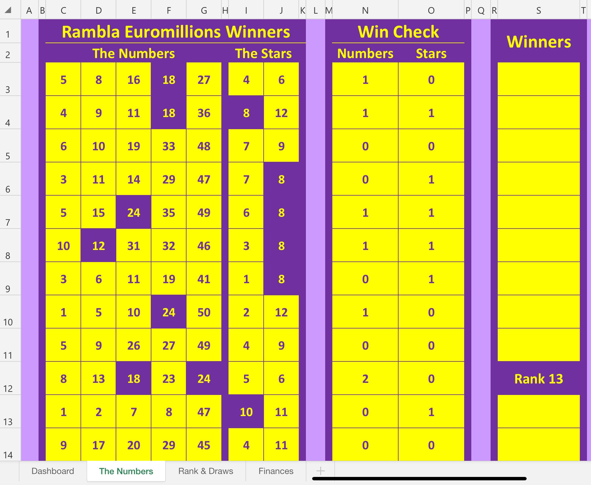 - The spreadsheet will highlight all the correct numbers and count how many were correct per entry and do whatever other special things Euromillions does (which I don't know) to determine a winner.