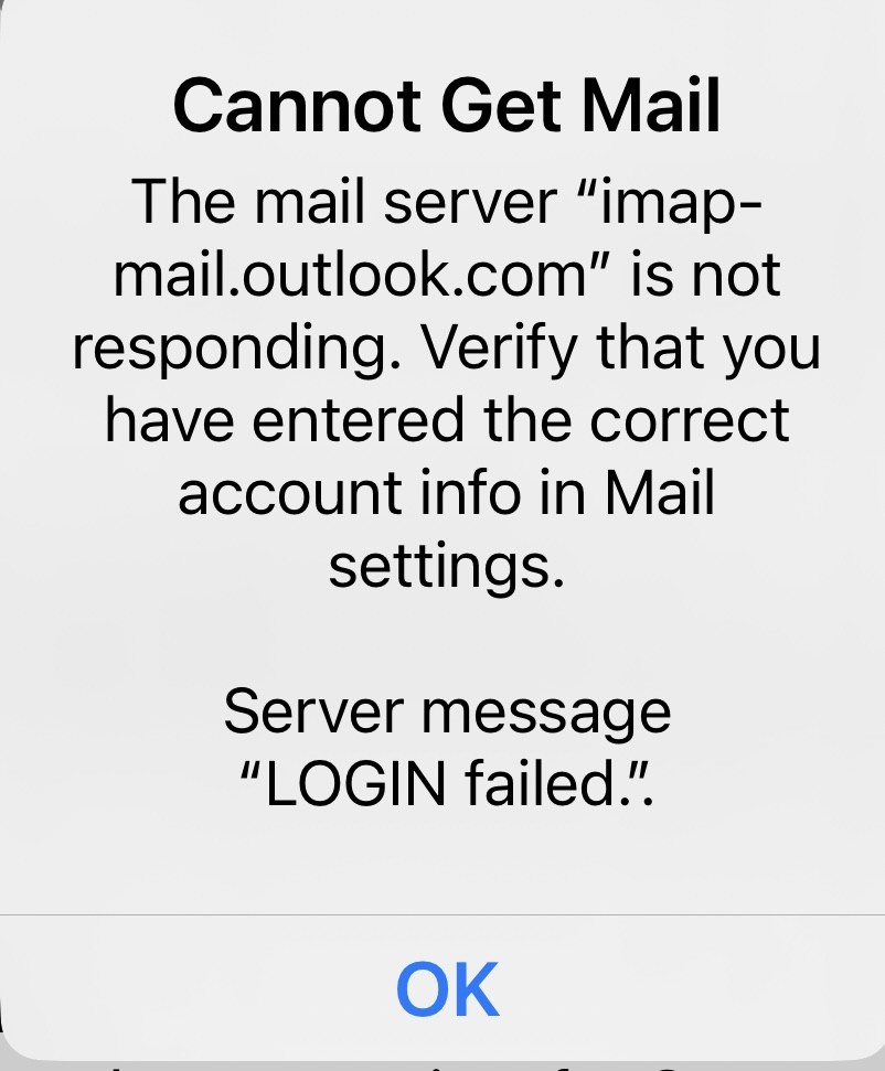 My hotmail mail will not load on my iPhone 13 Pro Max mail app. I started having issues with the 17 update but as of today, my mail has stopped loading completely. I have tried taking off the account and re-entering it and still nothing. I am up to date on all the updates. Is there any fix to this? It's very frustrating. I have attached a photo of what it says when I try to retrieve my mail.