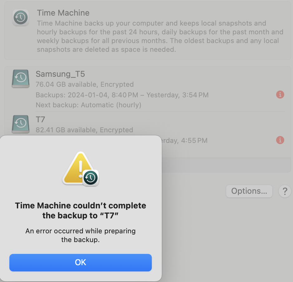 since the upgrade to 15.0 the Time Machine backup fails. The reason is some individual system files that cannot be backed up. Mostly some db files, such as the Library/Safari/History.db or files in the Firefox profiles. I have already excluded some files from the backup, but then Time Machine finds another file that cannot be backed up. The backup process is then canceled.