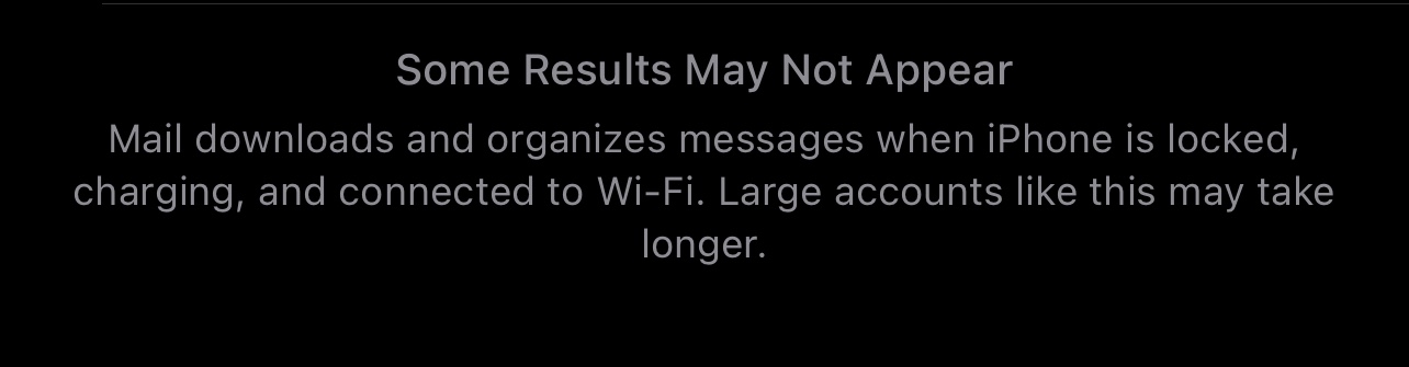 Mail downloads and organizes messages when iPhone is locked, charging, and connected to Wi-Fi. Large accounts like this may take longer.”