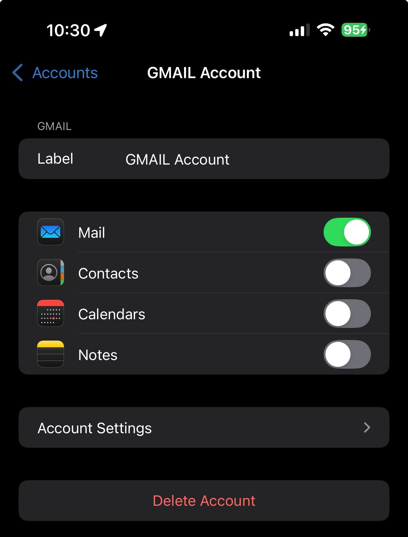 My main account is the Destcom, which is my work account. The Gmail is my personal account that I only use for email and nothing else. The others are the same, email only. The iCloud I use for nothing related to email, contacts, or calendar.