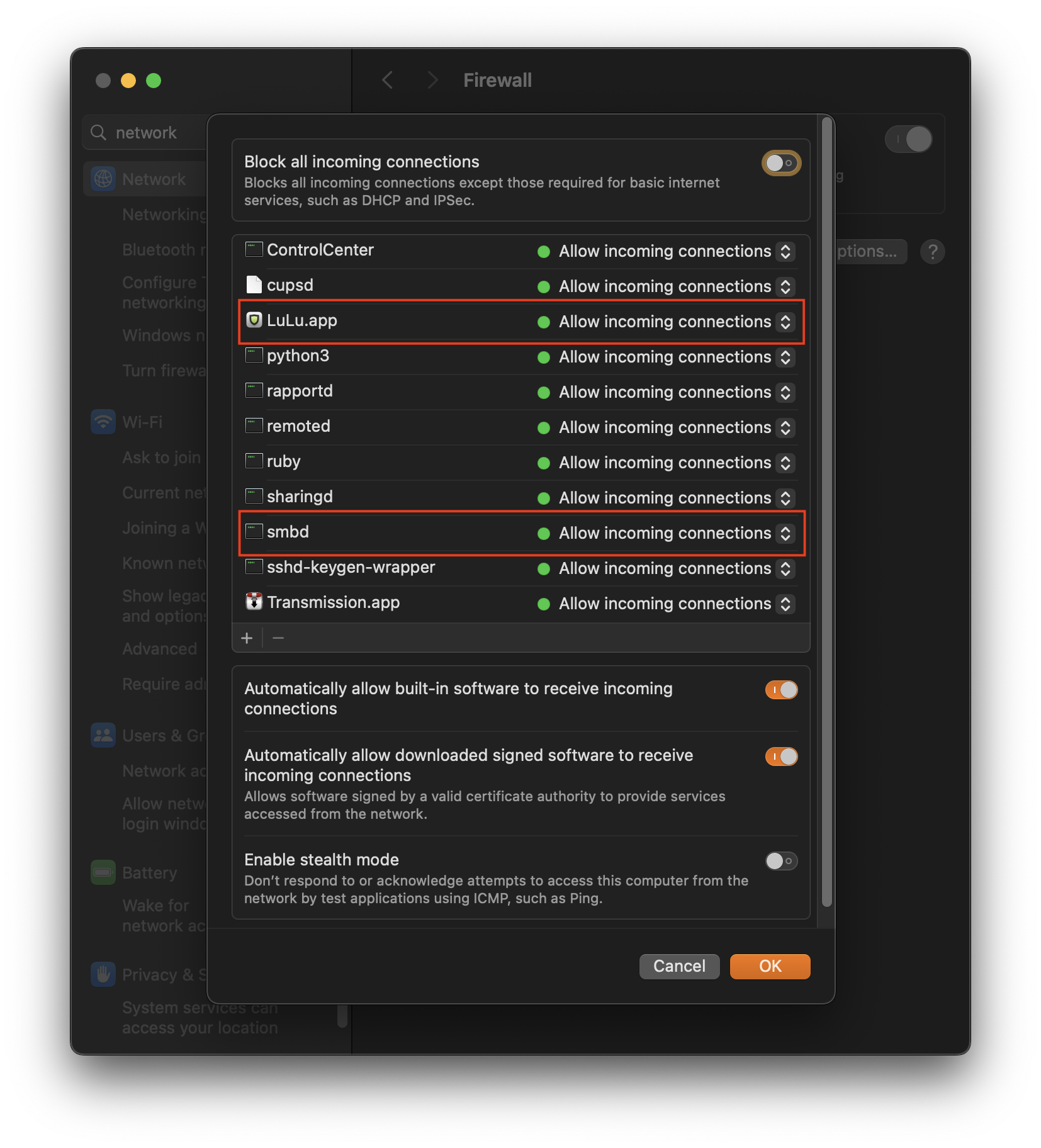 I was having the same problems – TM backups to my Synology NAS failing midway (via samba and afps). I did as people suggested and disabled Lulu and macOS built-in firewall and the backup functionality did work, but I kept testing. I found that after permitting smbd AND Lulu as a process/application in the firewall settings, I was able then able to enable the firewall AND Lulu AND successfully perform a TM backup. I'll see how it stands over time, but I wanted to share in case others would like to try this solution and report back if it works for them, too.