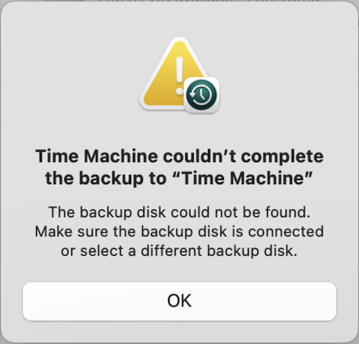 A few minutes after that, TimeMachine reports that the connection to the backup disc was lost and that the backup failed.
